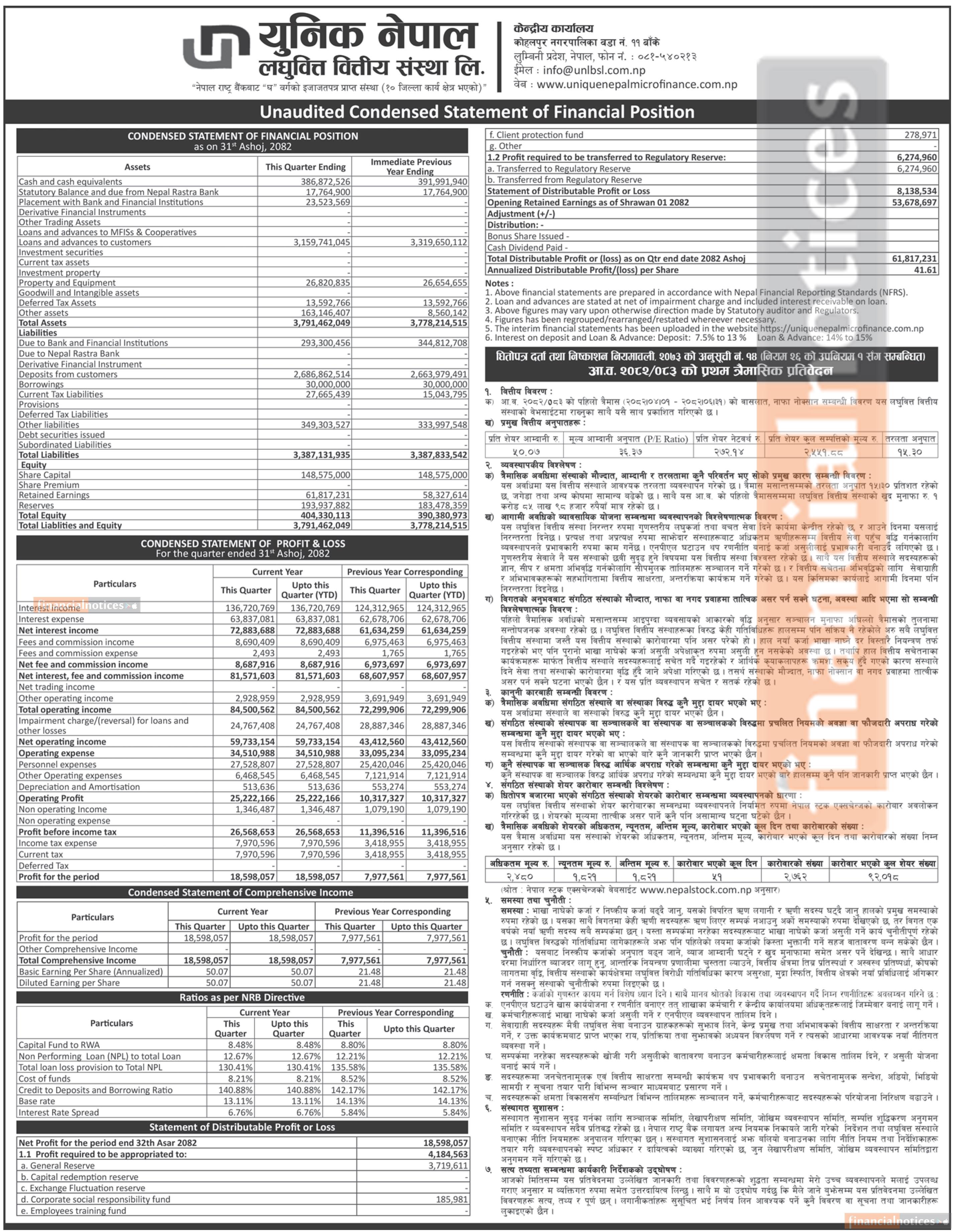 यूनिक नेपाल लघुवित्तको चालु आर्थिक वर्ष २०८२/८३ को पहिलो त्रैमासमा खुद नाफा १ करोड ८५ लाख रुपैयाँ