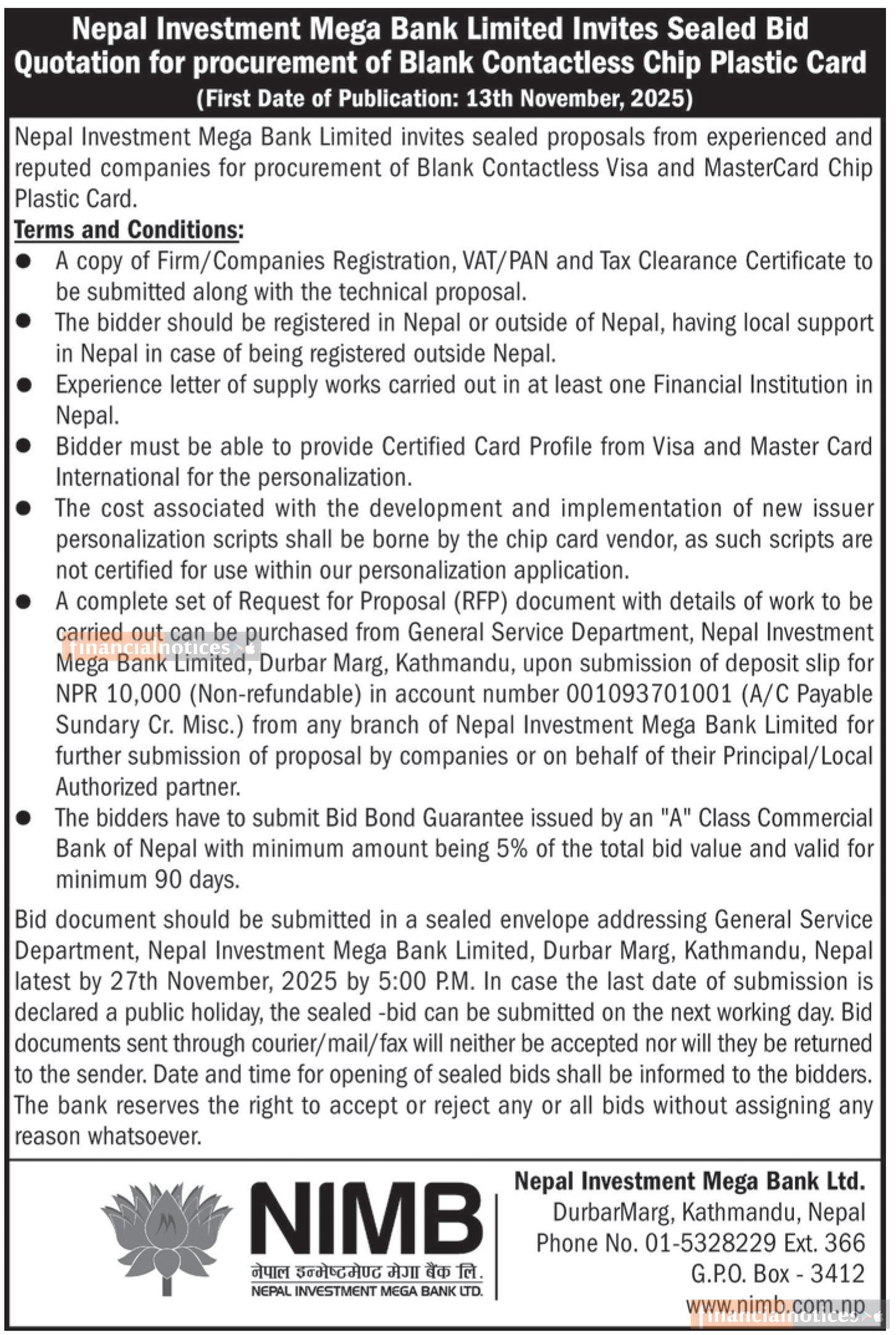 Notice Inviting Sealed Bids for Supply of Blank Contactless Chip Cards