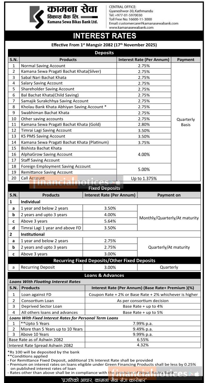 Kamana Sewa Bikas Bank Publishes New Interest Rates for Mangsir, 2082 -