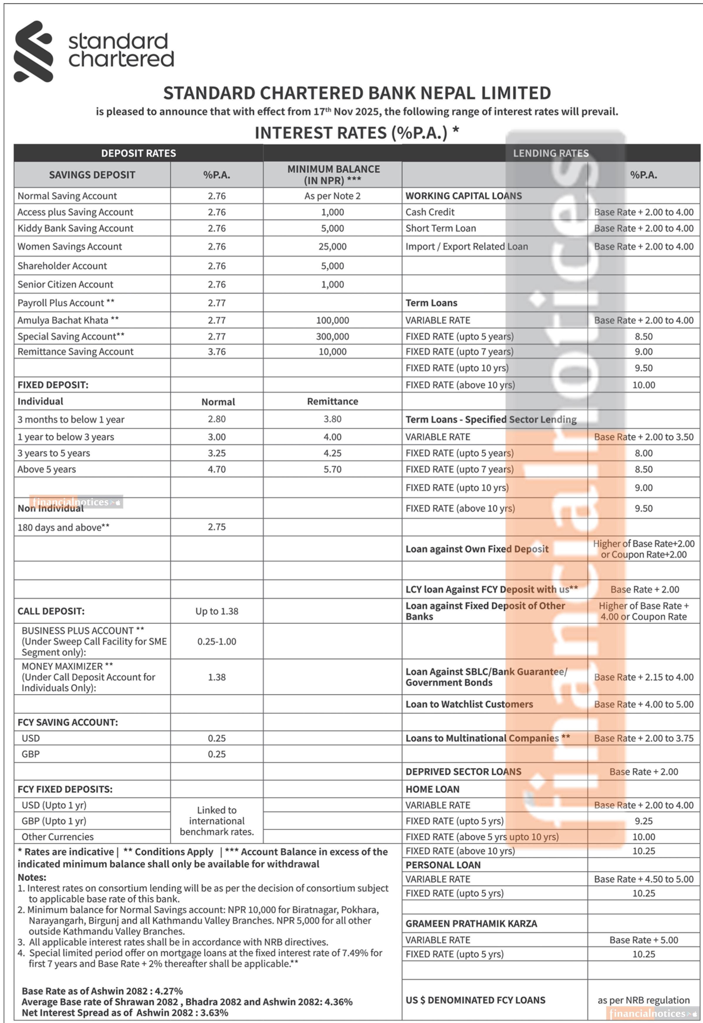 स्ट्याण्डर्ड चार्टर्ड बैंकको नयाँ ब्याजदर सार्वजनिक सम्बन्धी सूचना - Interest Rates -