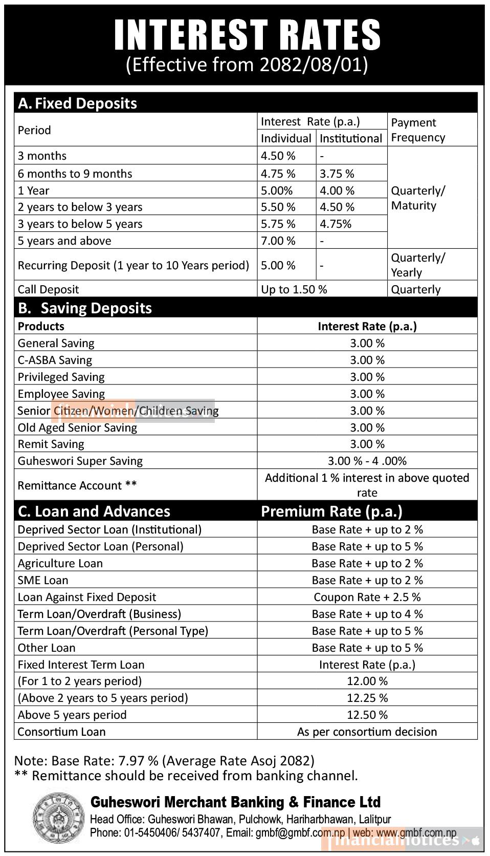 गुहेश्वरी मर्चेन्ट बैंकिङ्ग एण्ड फाइनान्सको नयाँ ब्याजदर सार्वजनिक सम्बन्धी सूचना - Interest Rates -