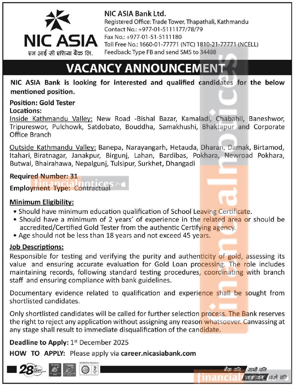 Kathmandu, Nepal — NIC ASIA Bank Ltd. has announced a vacancy for the position of Gold Tester, seeking qualified and interested candidates to join its network of branches both inside and outside the Kathmandu Valley.