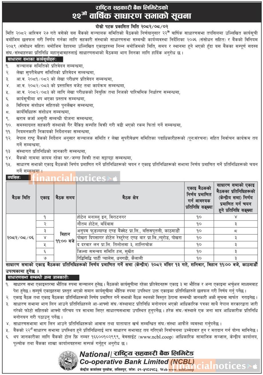 राष्ट्रिय सहकारी बैंकको २२औँ वार्षिक साधारण सभा सम्बन्धी सूचना