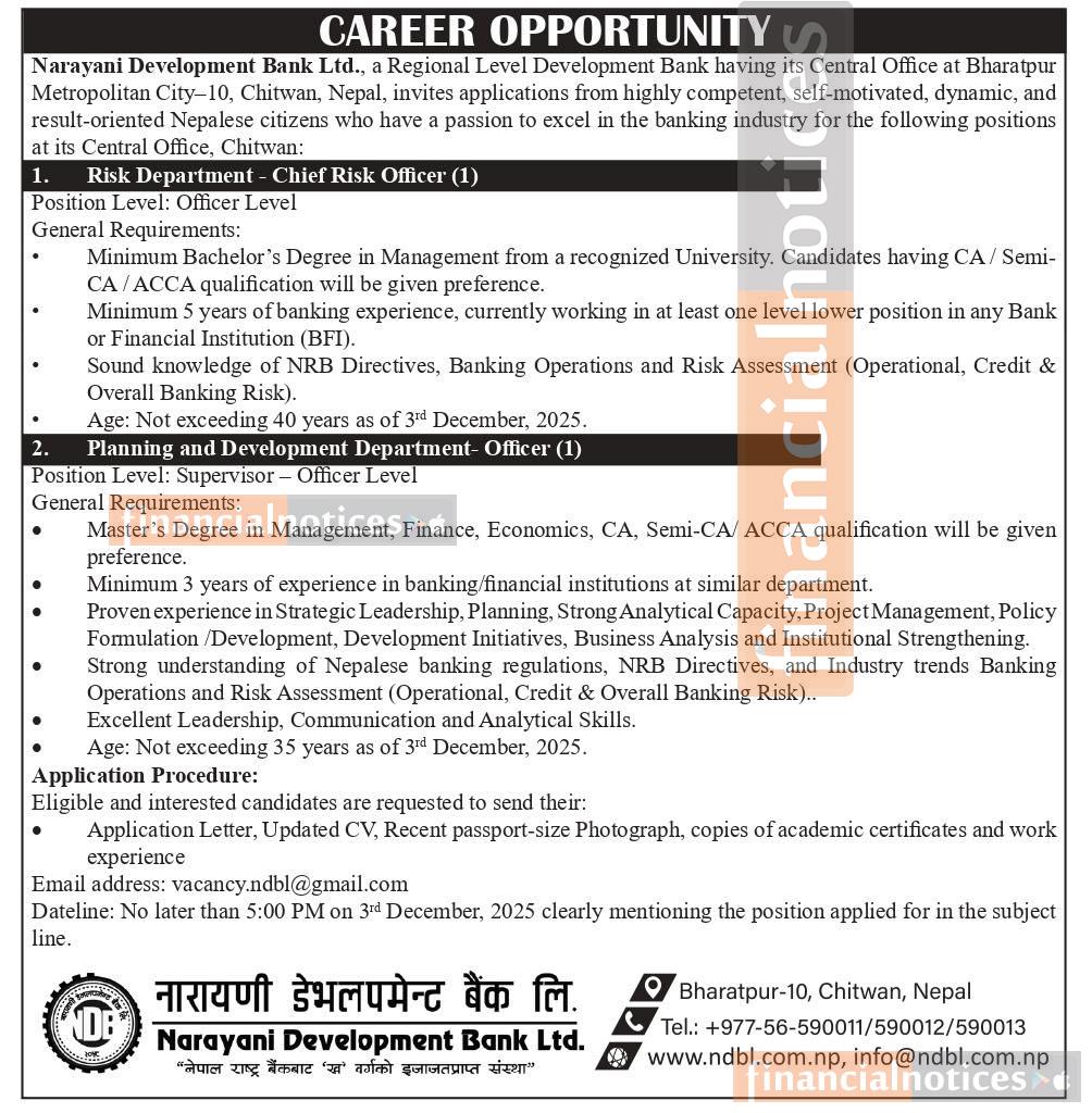 The bank is seeking one Chief Risk Officer for its Risk Department and one Officer for the Planning and Development Department. The positions are targeted at qualified, dynamic, and result-oriented Nepali professionals with strong backgrounds in banking and finance.
