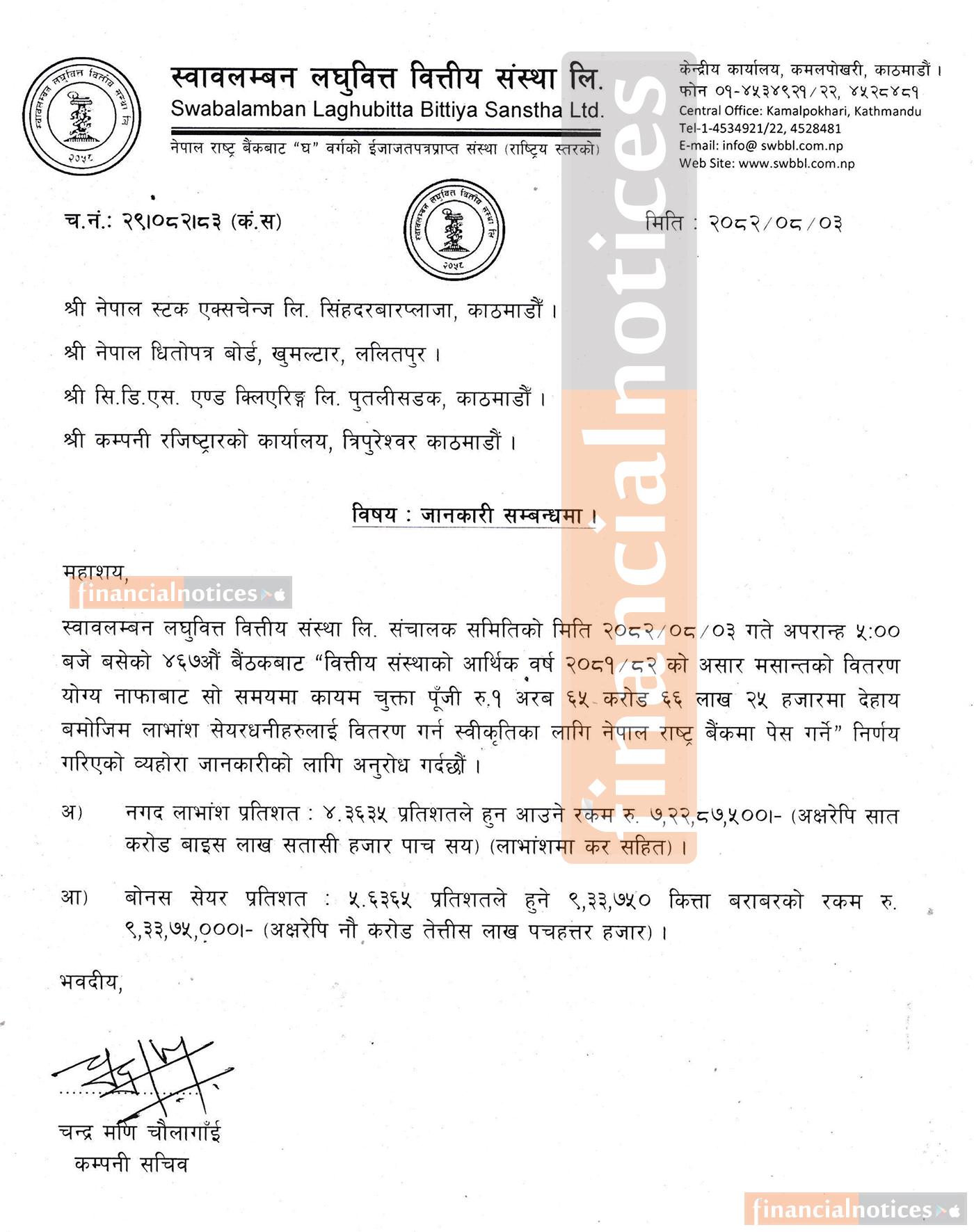 Swabalamban Laghubitta Bittiya Sanstha Ltd. (SWBBL) has declared a total dividend of 10% for the fiscal year 2081/82, including 5.6365% bonus shares and 4.3635% cash dividend (for tax purposes). The proposed dividend will be distributed after approval from Nepal Rastra Bank and endorsement by the upcoming AGM.