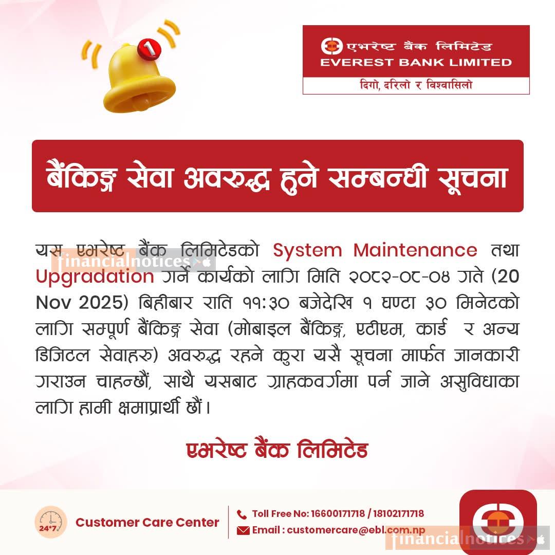 बैंकिङ्ग सेवा अवरुद्ध हुने सम्बन्धी एभरेष्ट बैंकको सूचना -