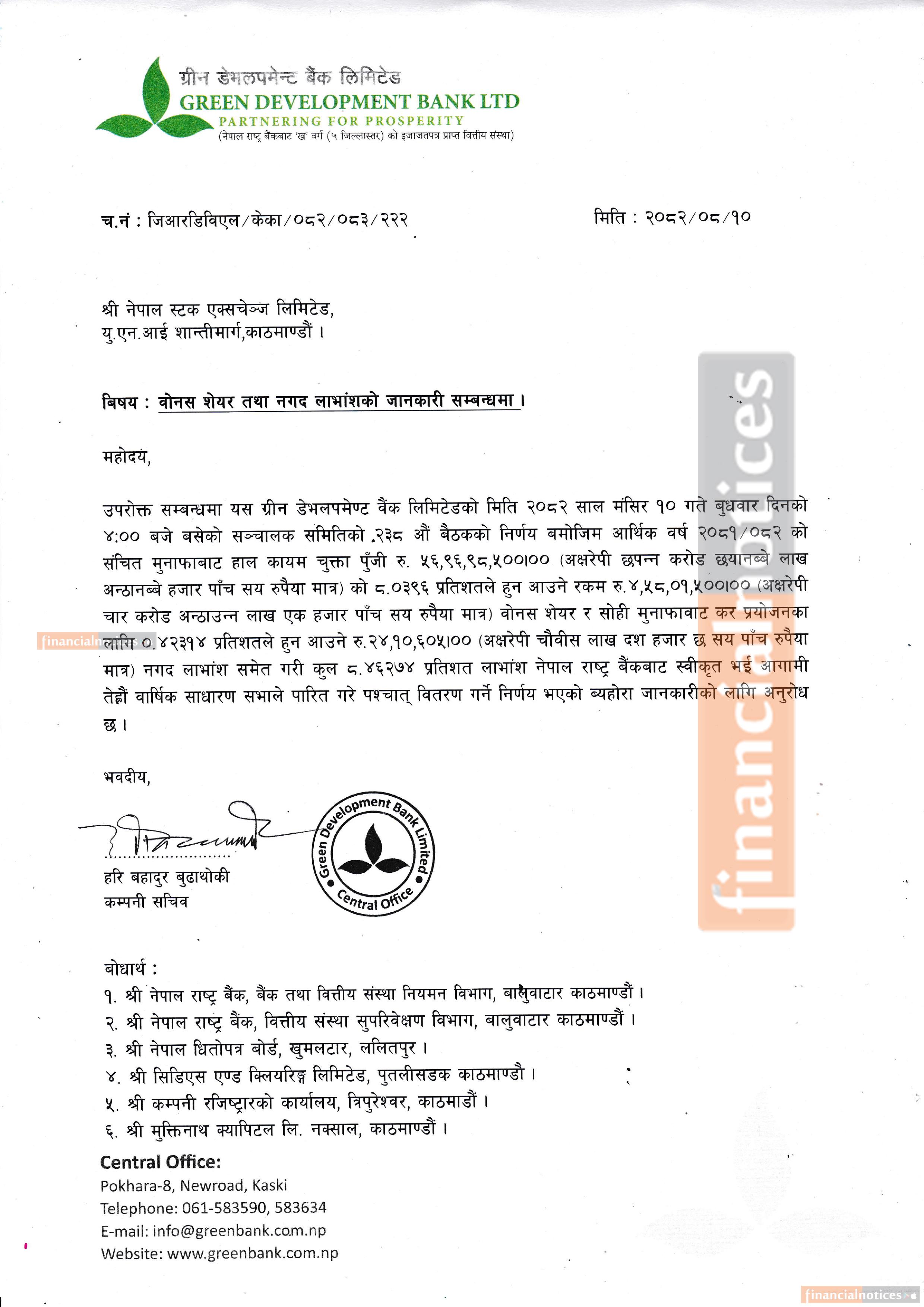 ग्रीन डेभलपमेन्ट बैंकको लाभांस घोषणा सम्बन्धी सूचना