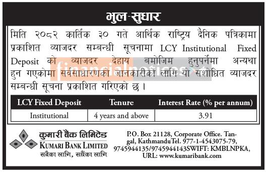 LCY Fixed Deposit ब्याजदरमा सुधार गर्दै कुमारी बैंकको अद्यावधिक सूचना