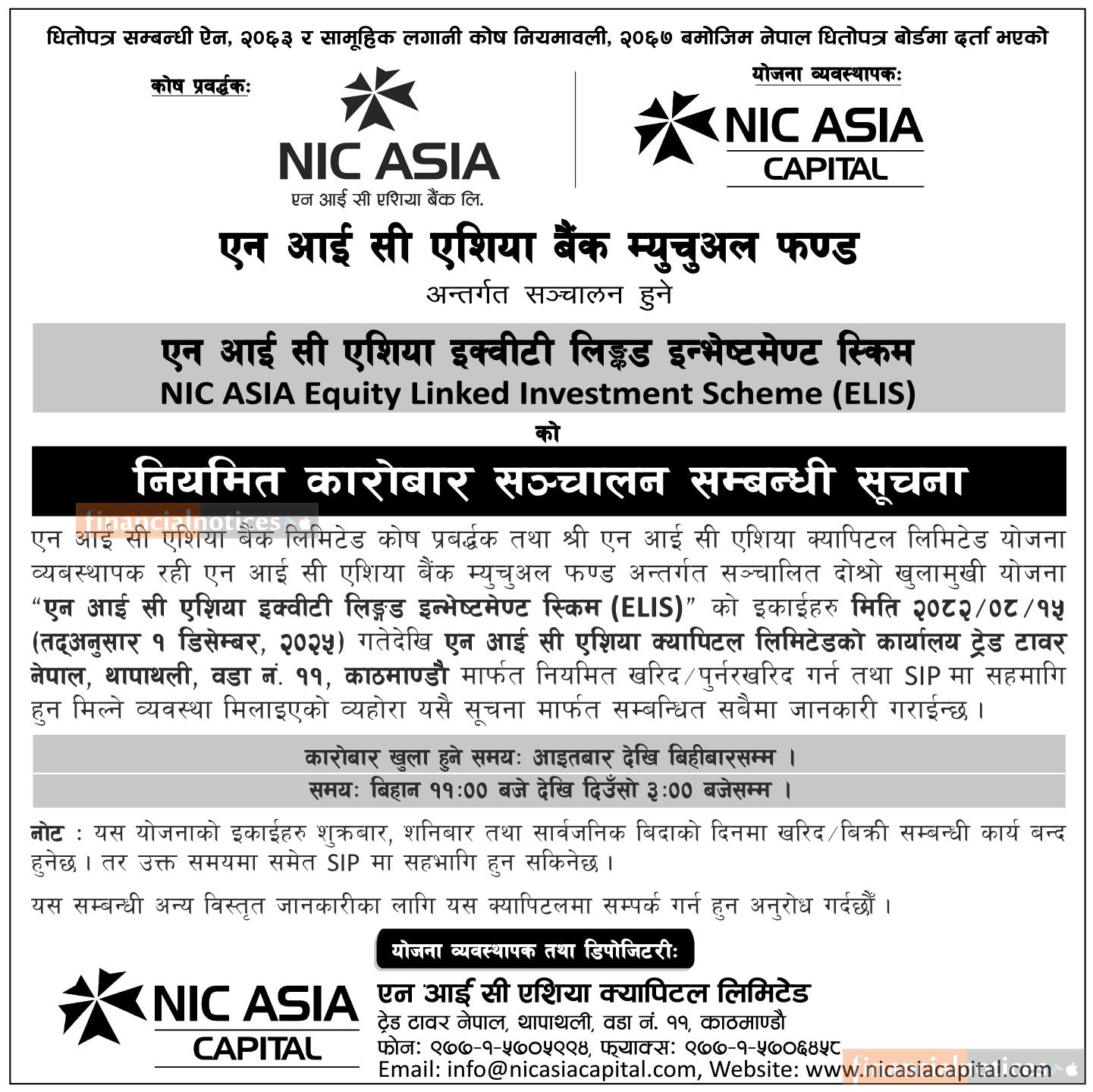 एनआईसी एशियाको ELIS योजनाको नियमित कारोबार सुरु हुने सम्बन्धी जरुरी सूचना
