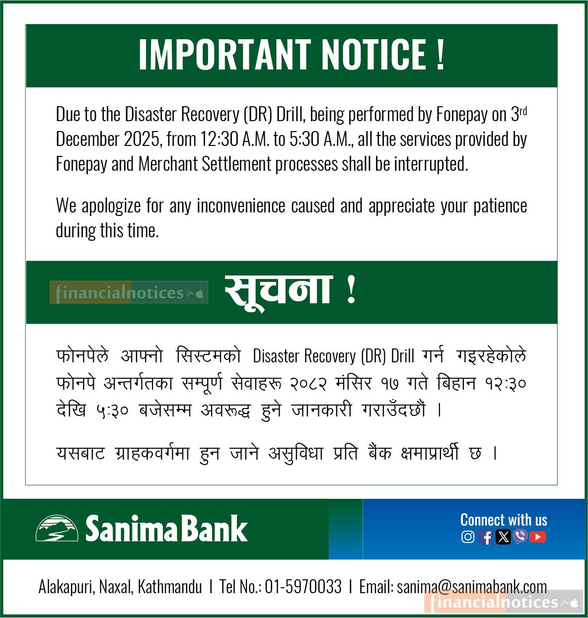 बैंकिङ्ग सेवा अवरुद्ध हुने सम्बन्धी सूचना