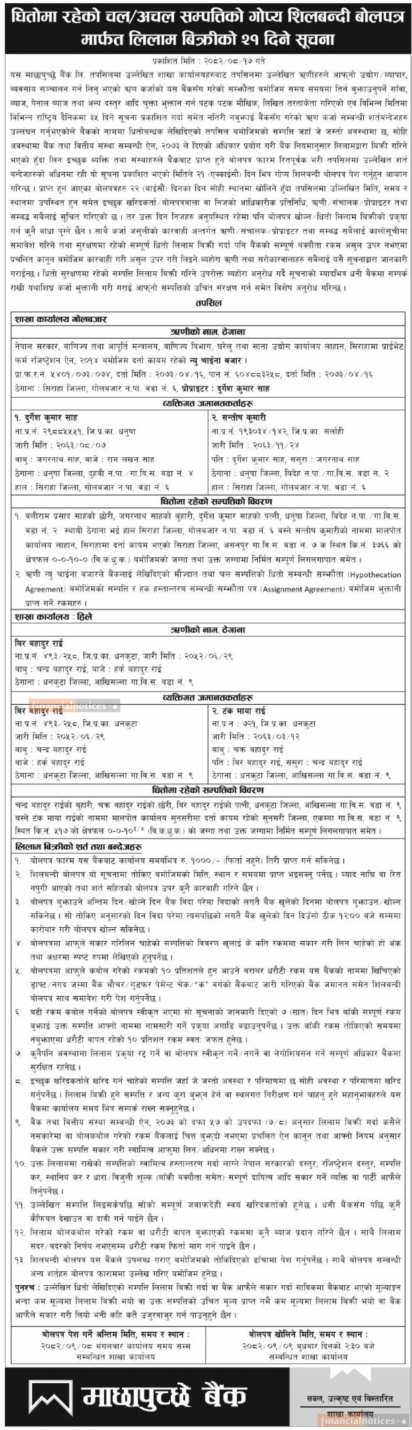 Kumari Bank Auction Notice for Non-Banking Assets at Mahendranagar, Kanchanpur -