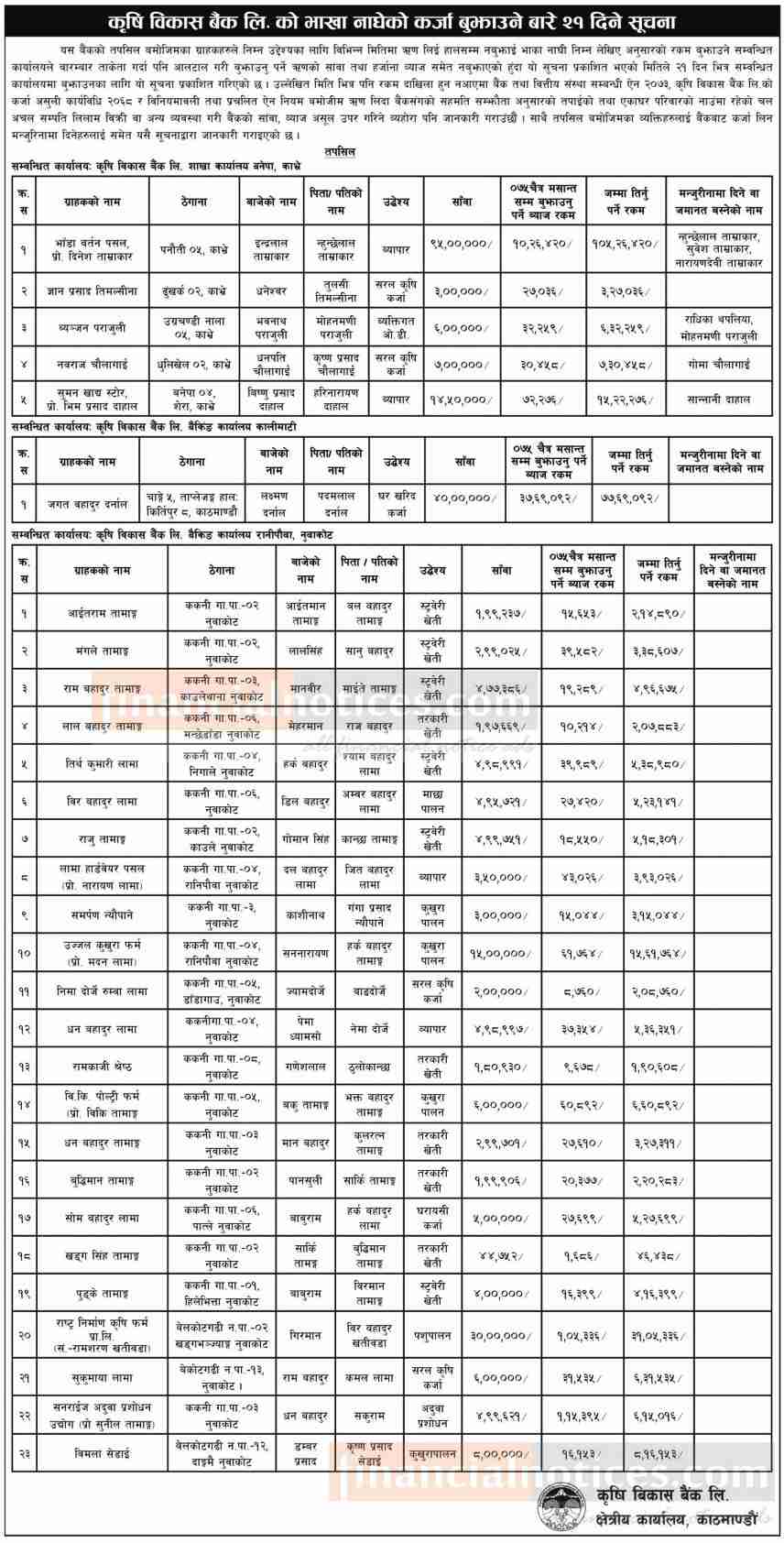 ऋणीहरुलाई कर्जा चुक्ता भुक्तान गर्ने तथा धितो लिलाम बिक्री सम्बन्धी २१ दिने सूचना
