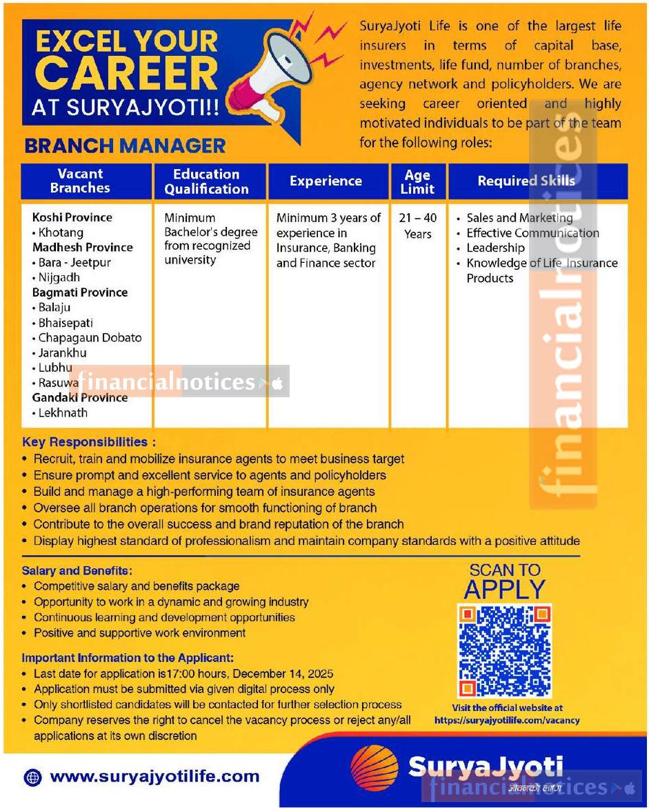 Kathmandu — SuryaJyoti Life Insurance Company, one of Nepal’s leading life insurers in terms of capital base, investments, life fund, branch network, and policyholders, has announced vacancies for the position of Branch Manager in various provinces across the country. The company is seeking dynamic, career-oriented, and highly motivated individuals to join its expanding team.