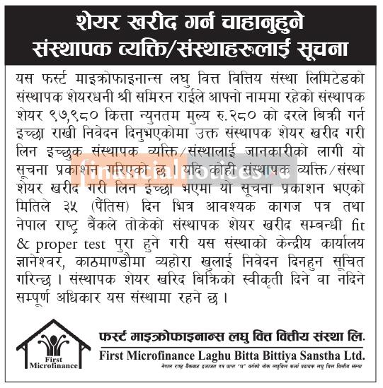 संस्थापक सेयर खरिदका लागि इच्छुक व्यक्तिहरूलाई सार्वजनिक सूचना