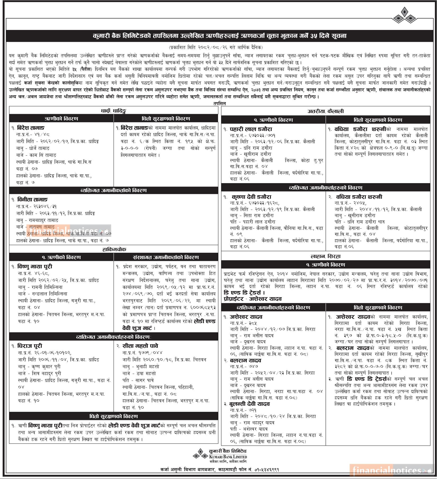 कुमारी बैंकका ऋणीहरूलाई ऋणकर्जा चुक्ता भुक्तान गर्ने सम्बन्धी सूचना