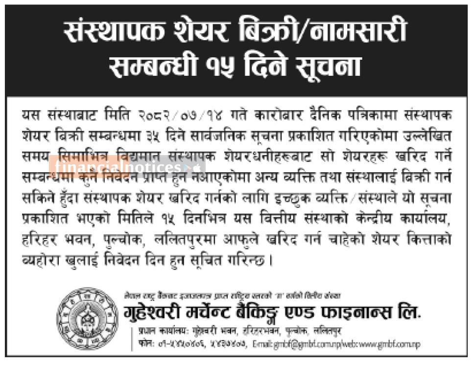 संस्थापक शेयर बिक्री नामसारी सम्बन्धी १५ दिने सूचना