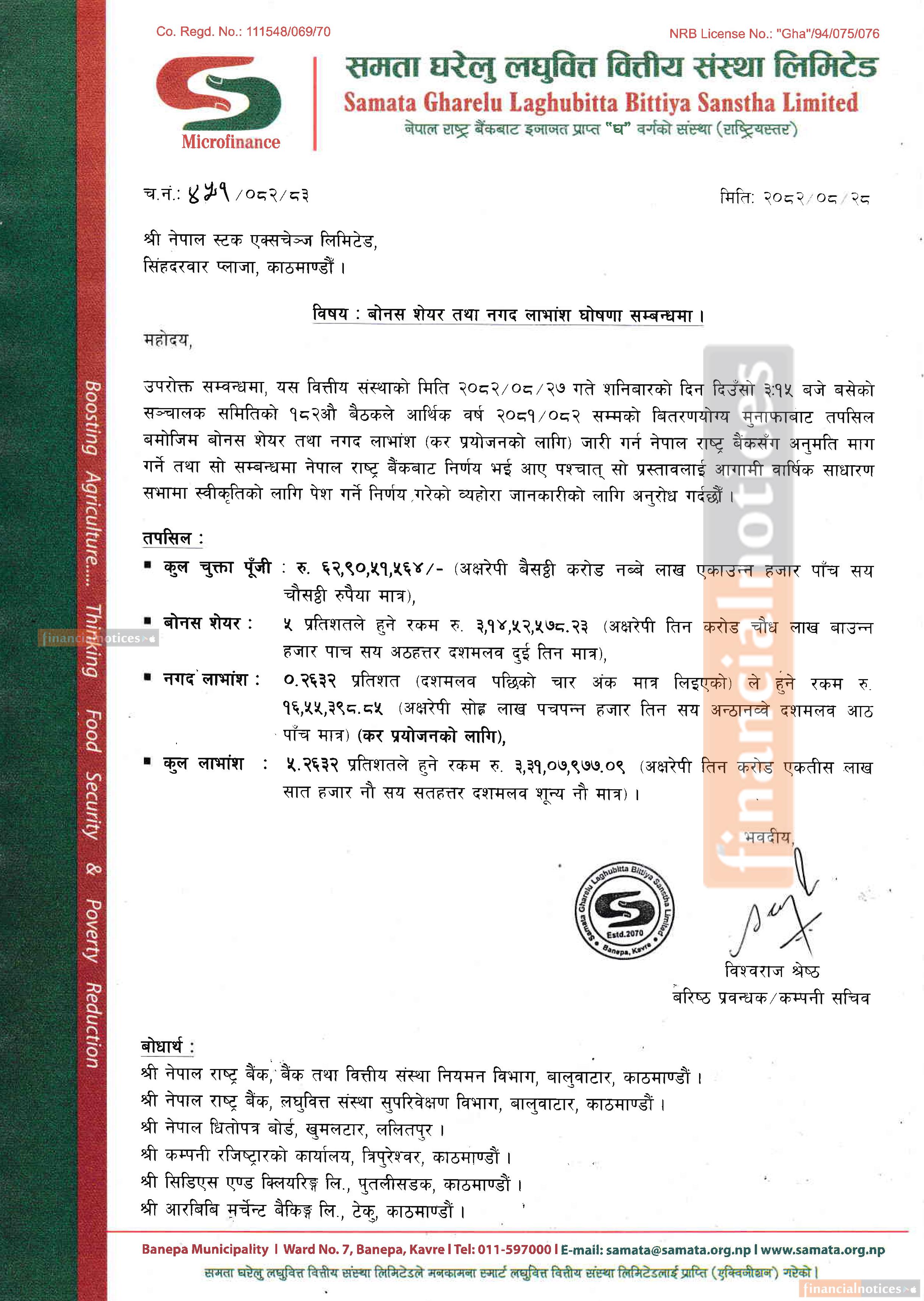 समता घरेलु लघुवित्तले लाभांश घोषणा सम्बन्धी सूचना