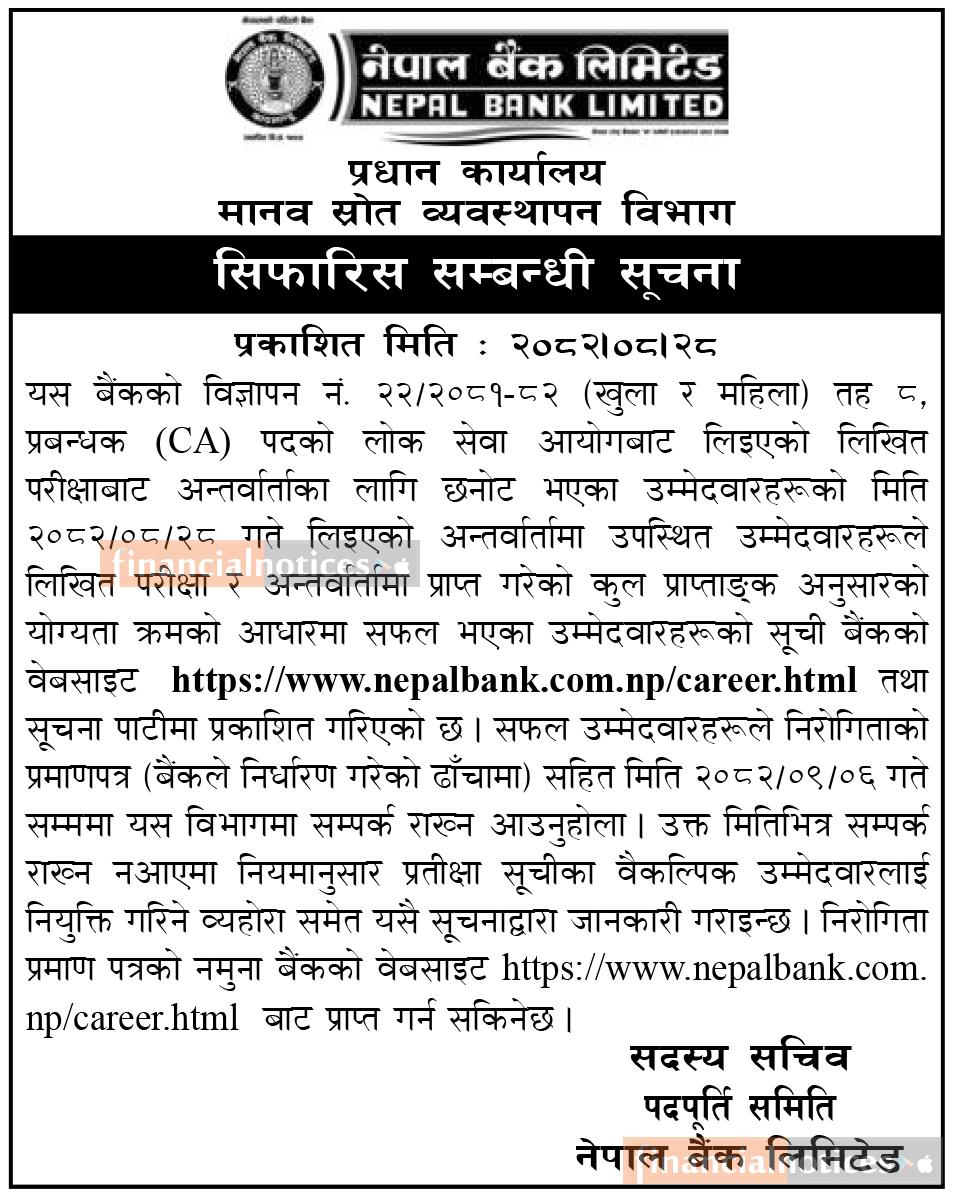 नेपाल बैंकद्वारा सहायक (CA) पदका लागि छनोट भएका उम्मेदवारलाई सिफारीस सम्बन्धी सूचना