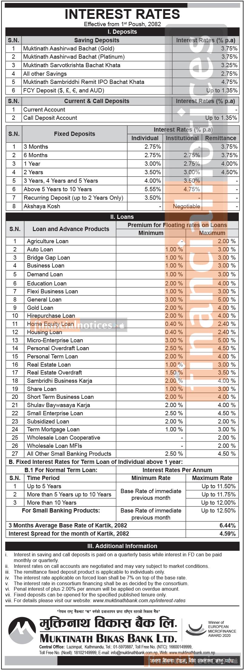 Muktinath Bikas Bank Publishes New Interest Rates Effective from Poush 2082 -