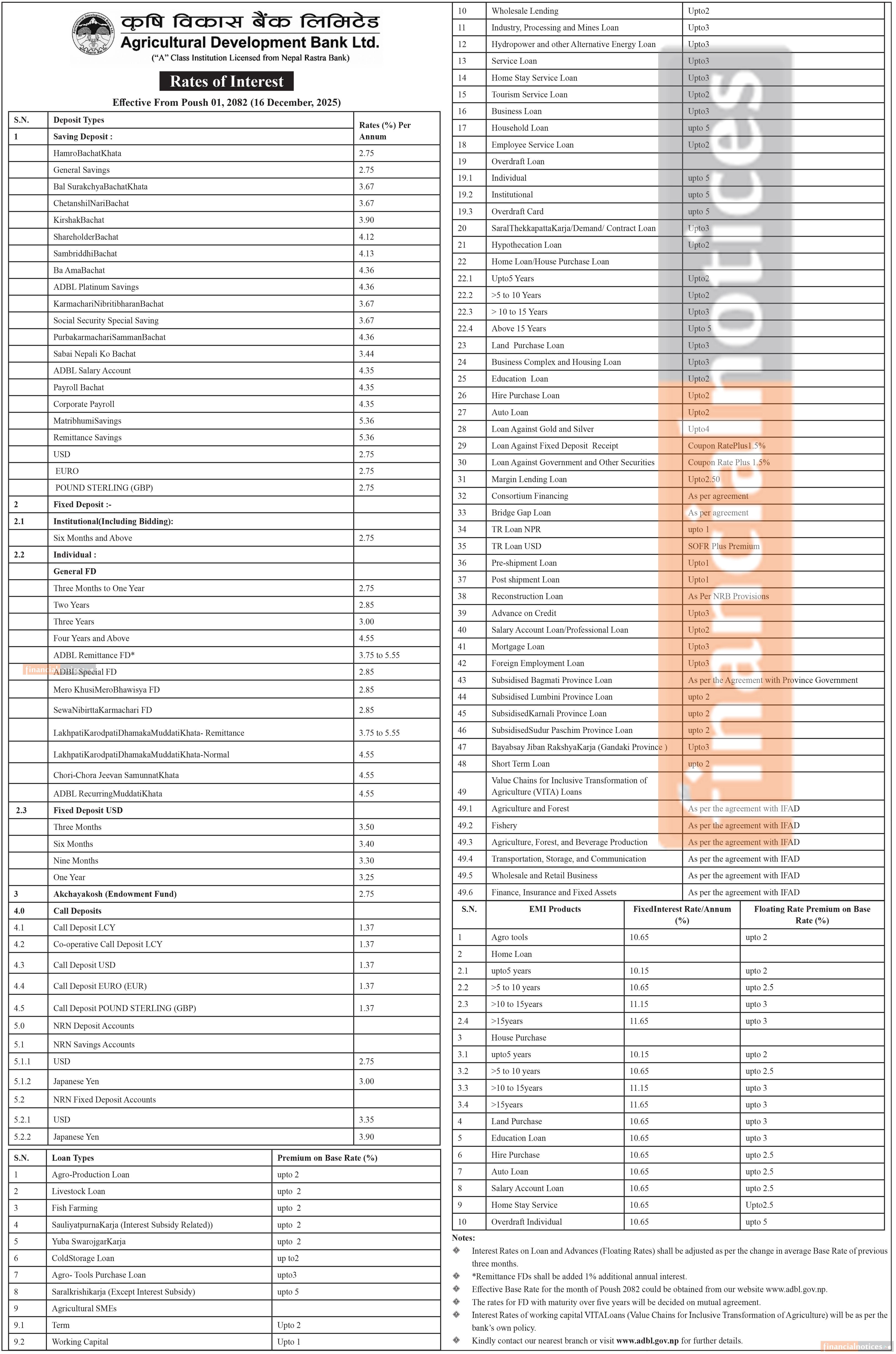 Agricultural Development Bank Limited Publishes New Interest Rates Effective from Poush 2082 -