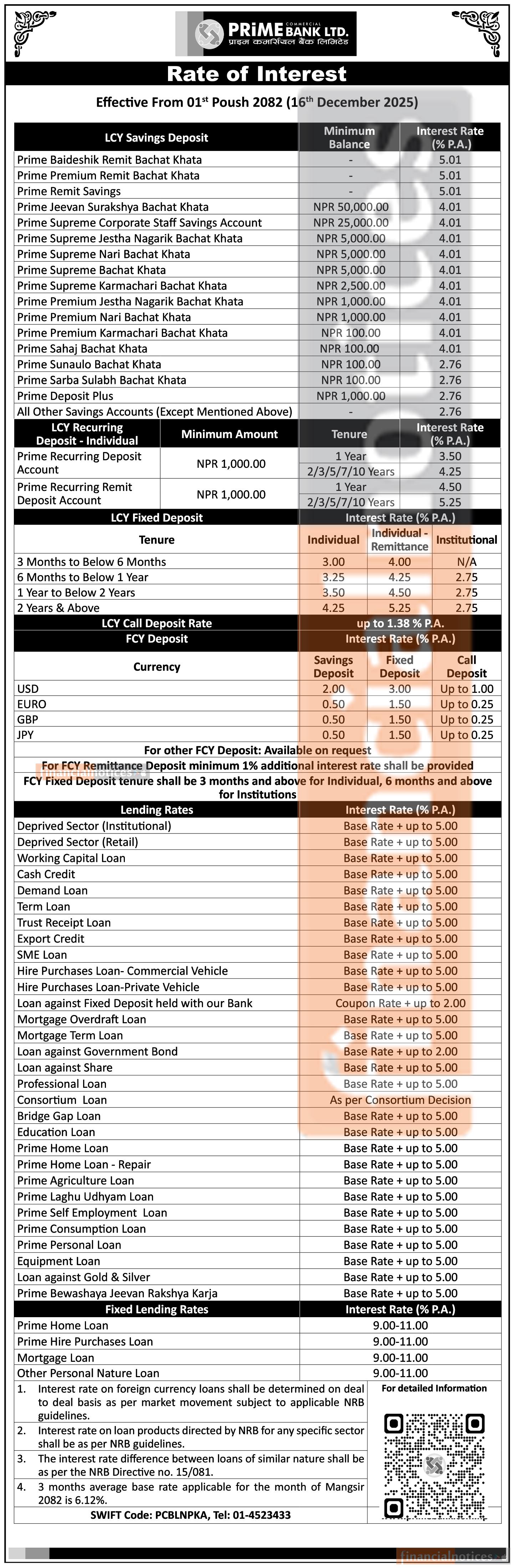 Prime Commercial Bank Limited Publishes New Interest Rates Effective from Poush 2082 -