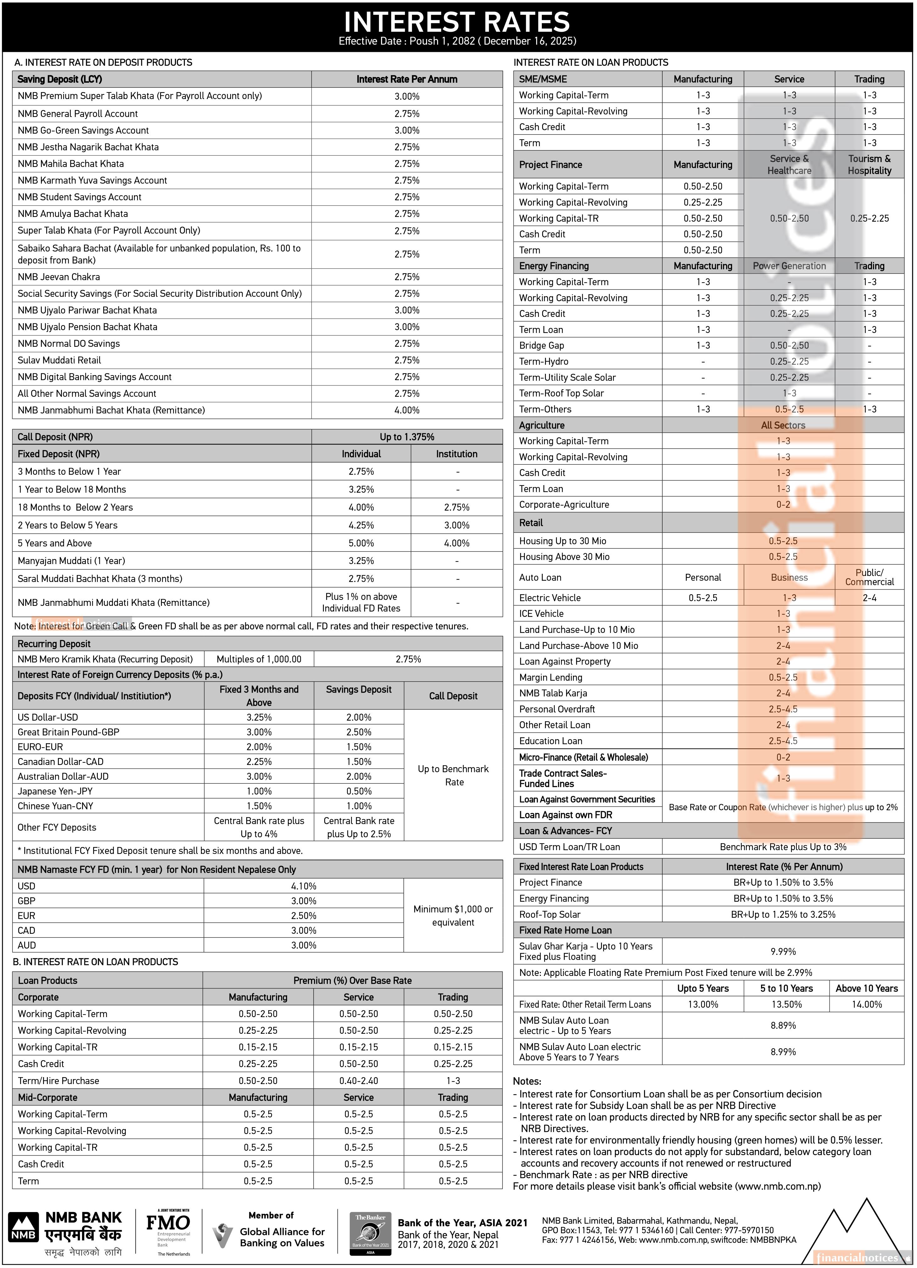 NMB Bank Limited Publishes New Interest Rates Effective from Poush 2082 -