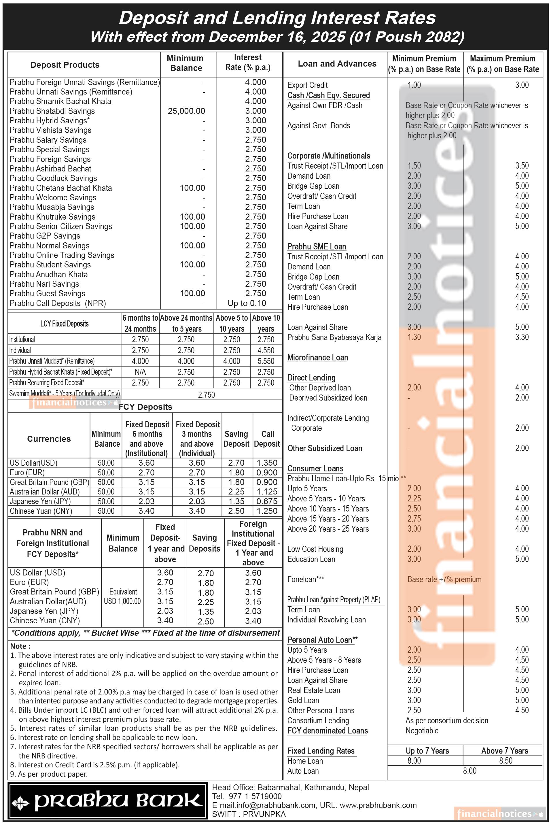 Prabhu Bank Limited Publishes New Interest Rates Effective from Poush 2082 -