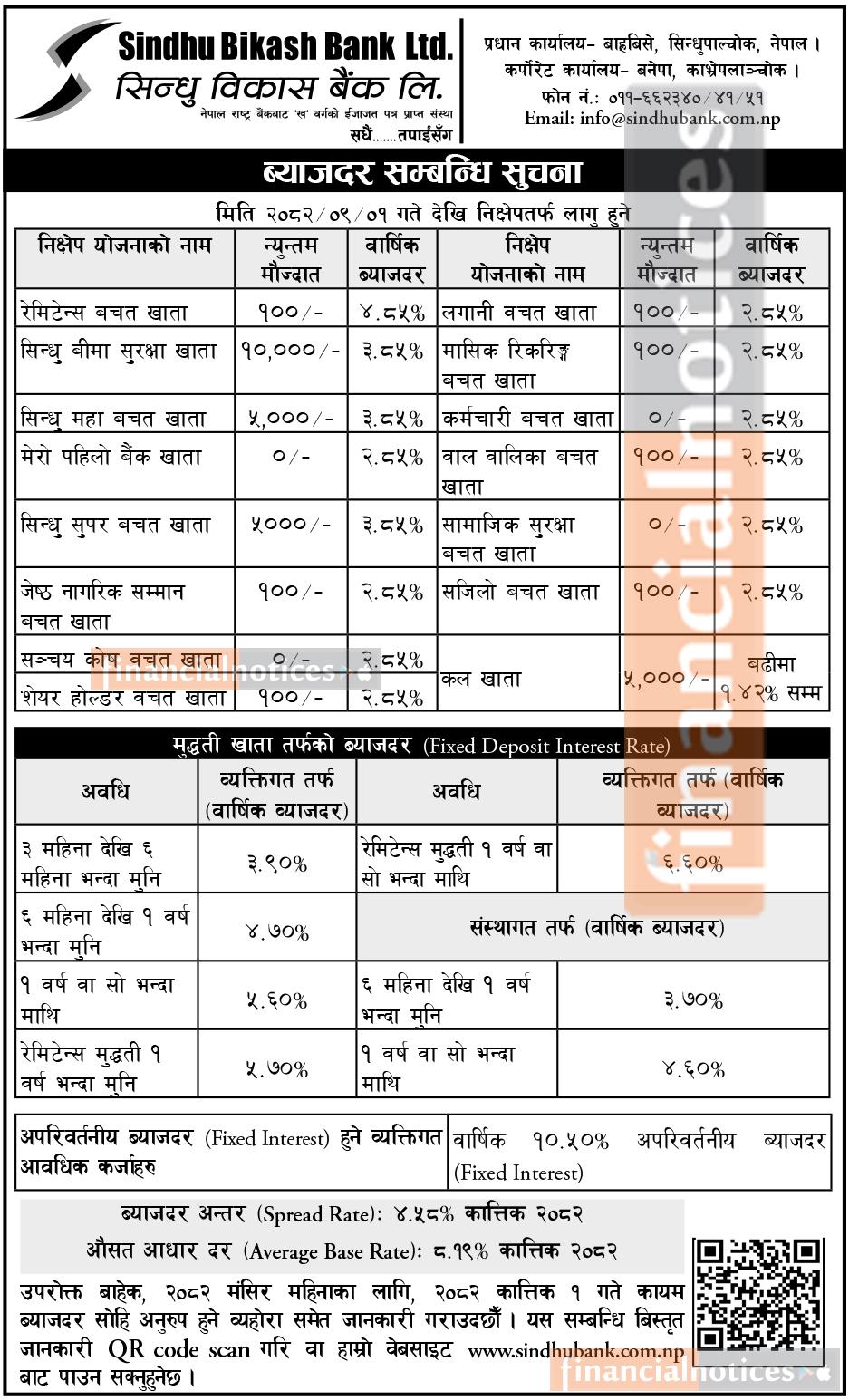 सिन्धु विकास बैंकको पुषदेखि नयाँ ब्याजदर लागू – कुन खातामा कति पाइन्छ ब्याजदर?