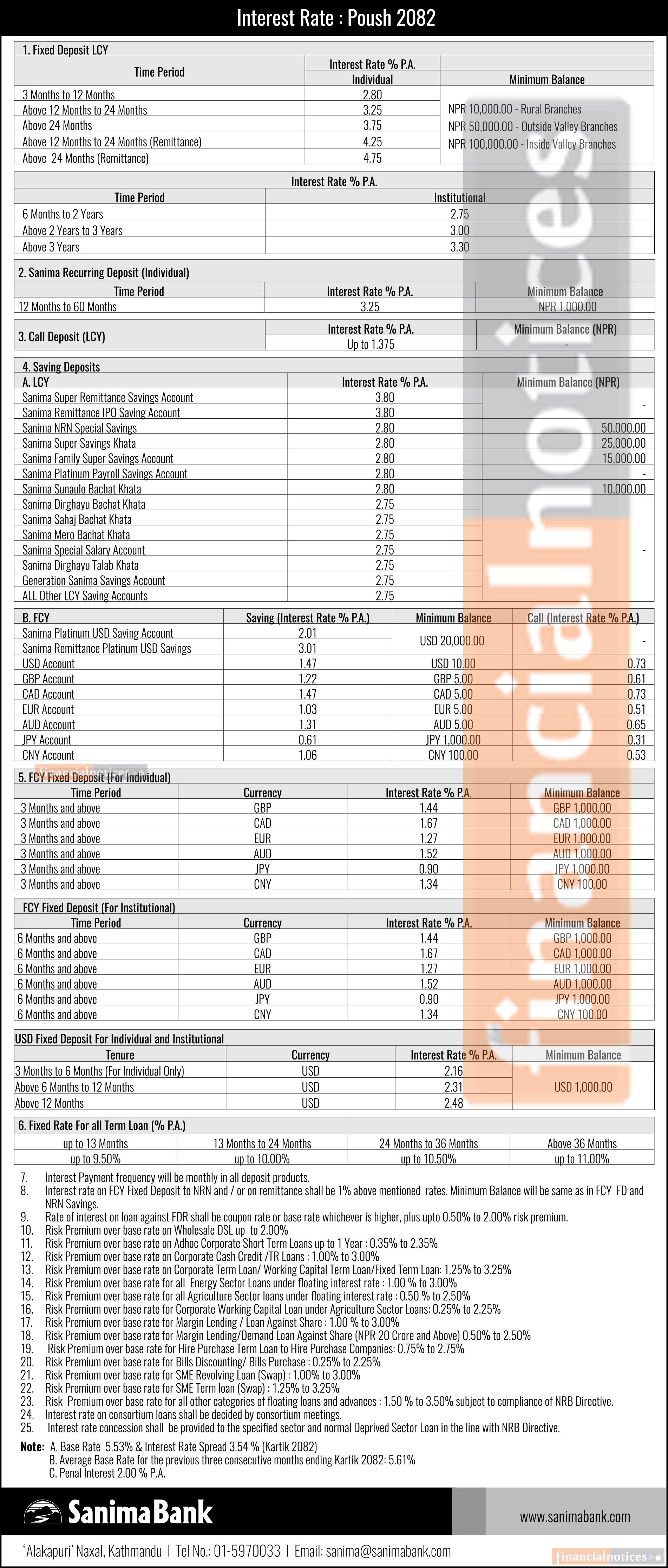 Sanima Bank Limited Publishes New Interest Rates Effective from Poush 2082 -