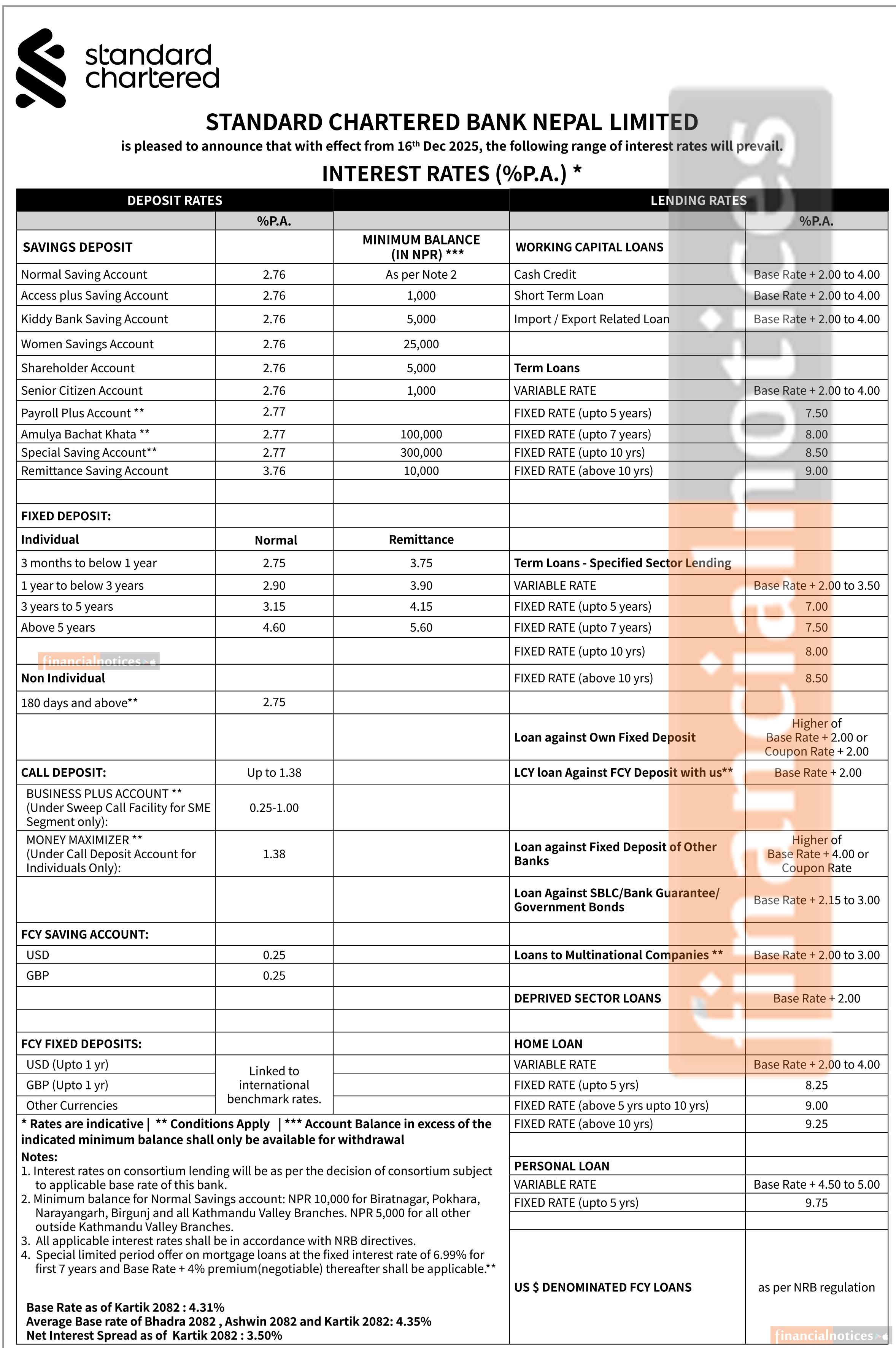 Standard Chartered Bank Limited Publishes New Interest Rates Effective from Poush 2082 -