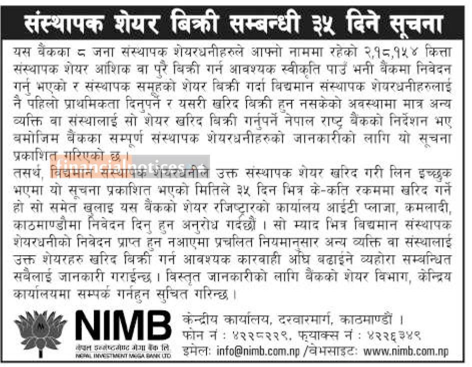 संस्थापक शेयर बिक्री सम्बन्धी ३५ दिने सूचना