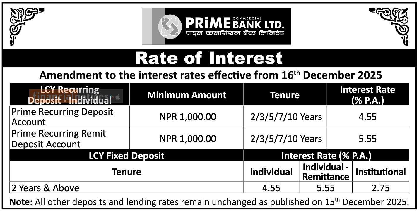 प्राइम कमर्सियल बैंकको ब्याजदर संसोधन सम्बन्धी सूचना