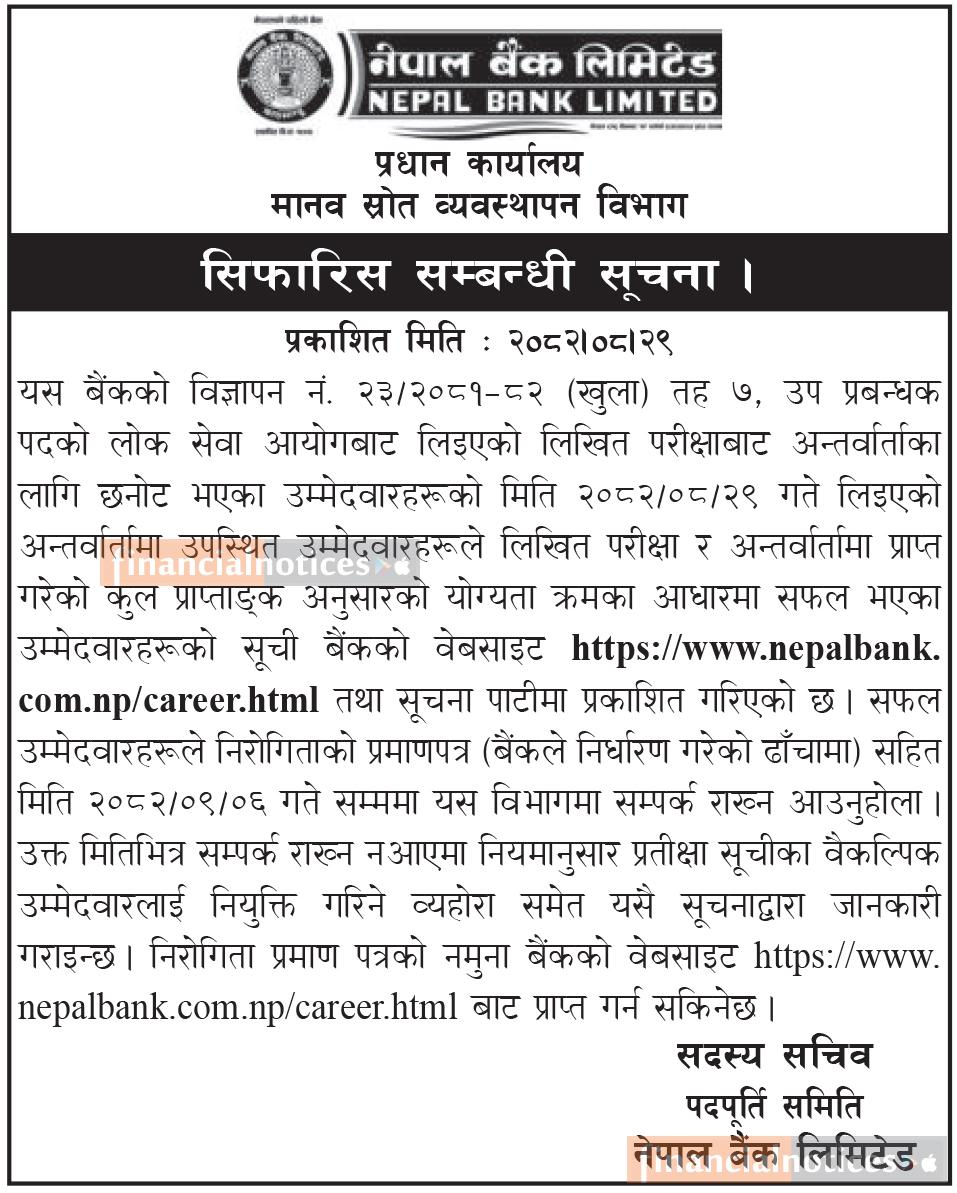 उप–प्रबन्धक पदको लिखित तथा अन्तर्वार्ताबाट छनोट भएका उम्मेदवारको सिफारिस सम्बन्धी नेपाल बैंकको सूचना