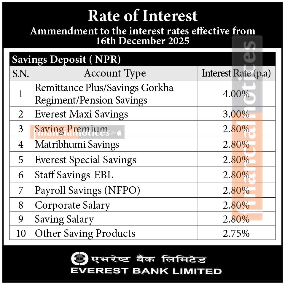 एभरेष्ट बैंकको ब्याजदर संसोधन गरिएको सम्बन्धी सूचना
