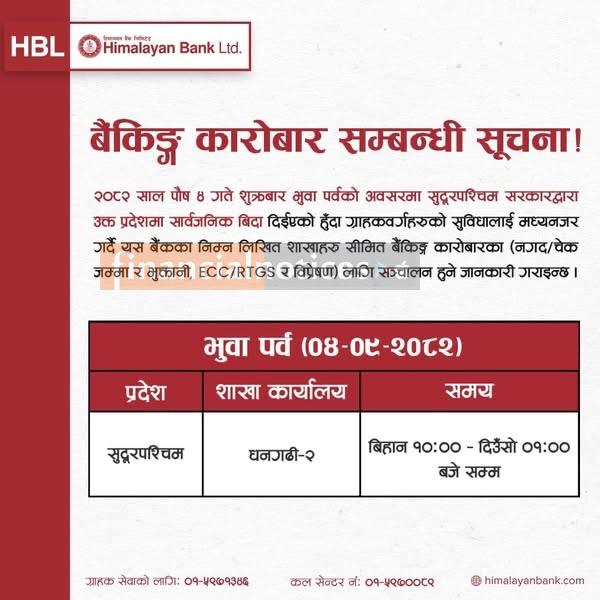 बैंकिङ कारोबार सम्बन्धी हिमालयन बैंकको सूचना