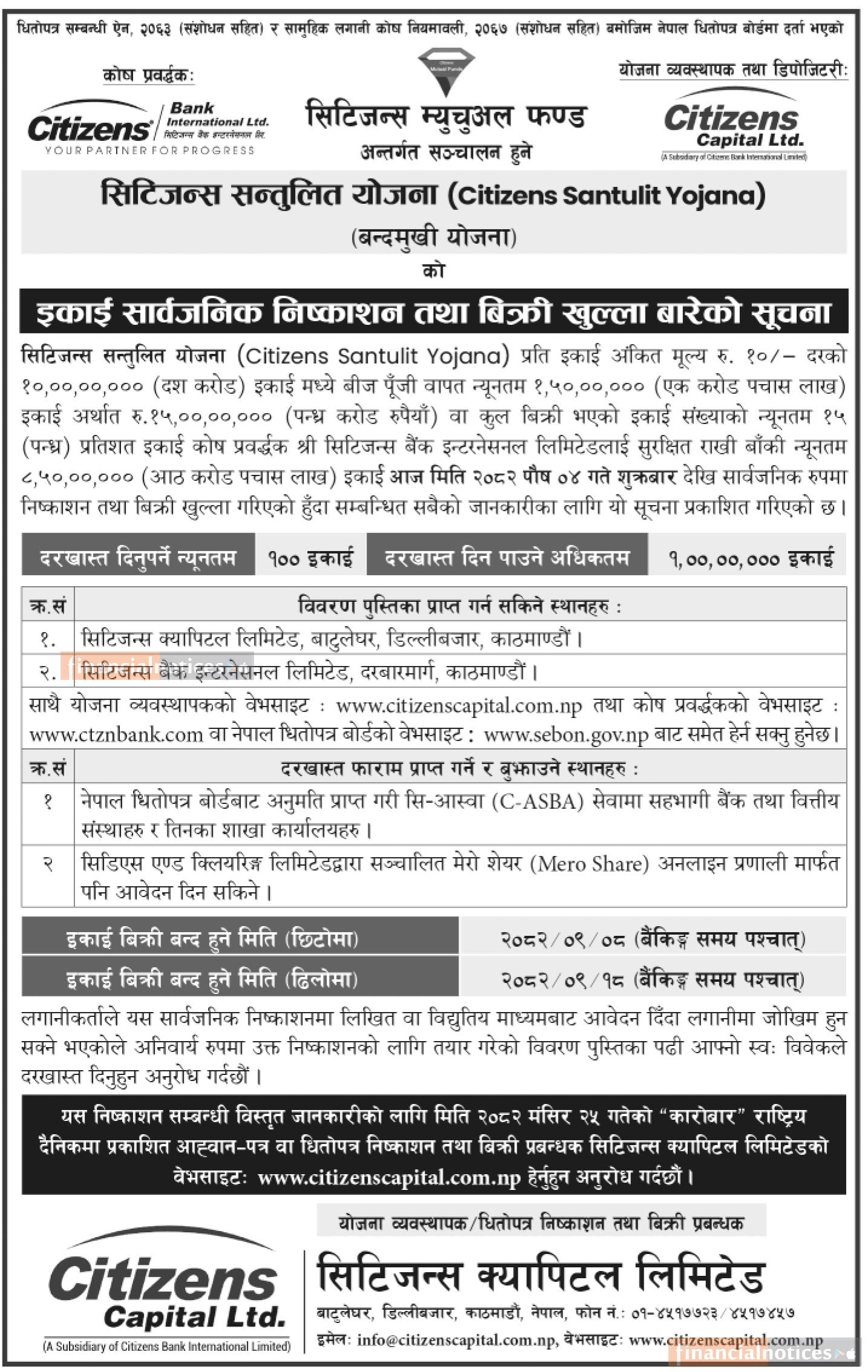 सिटिजन्स सन्तुलित योजनाको इकाई खरिदका लागि आजदेखि आवेदन खुला सम्बन्धी सूचना