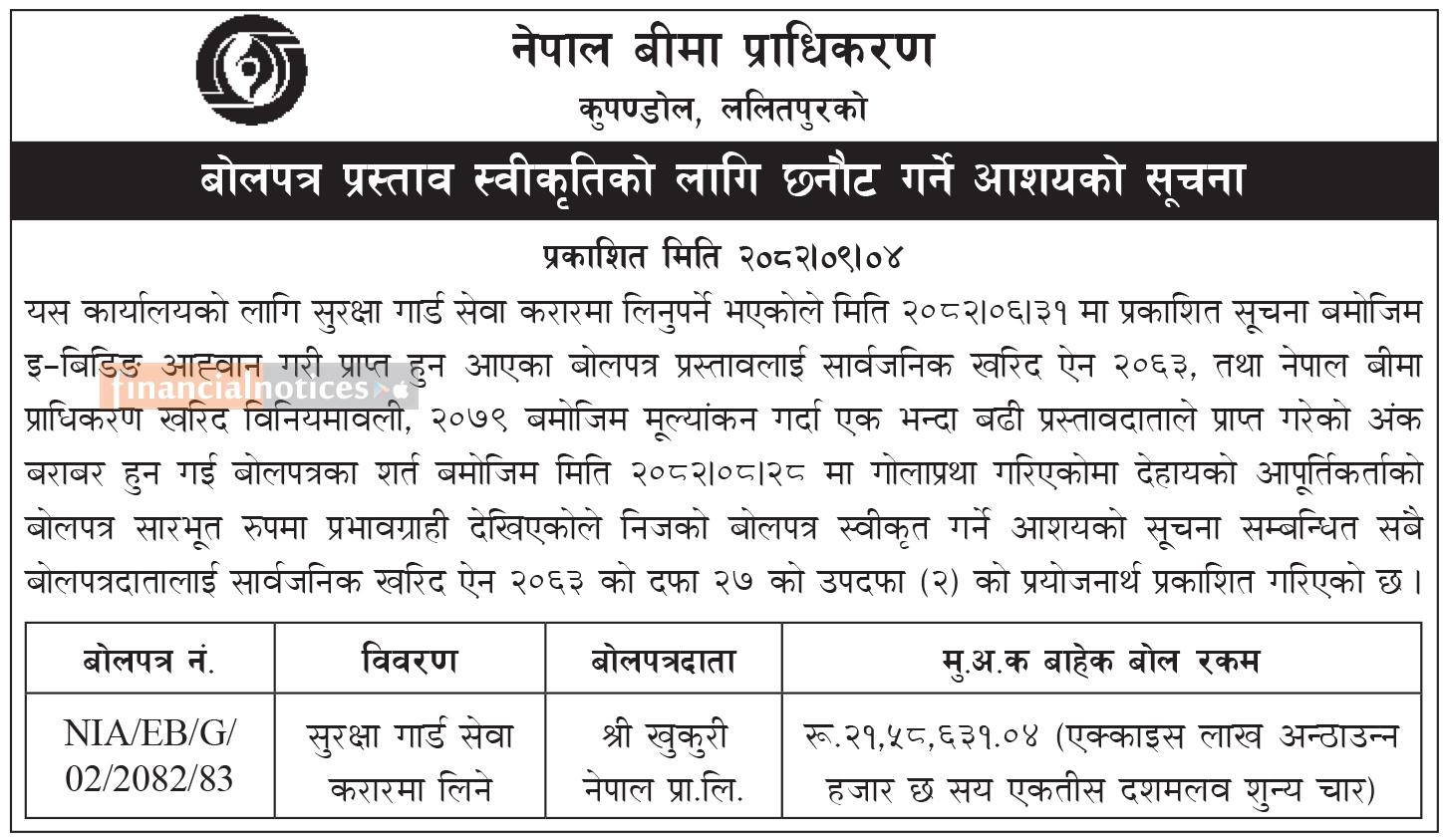 बोलपत्र प्रस्ताव स्वीकृतको लागि छनौट भएको आशयको सूचना