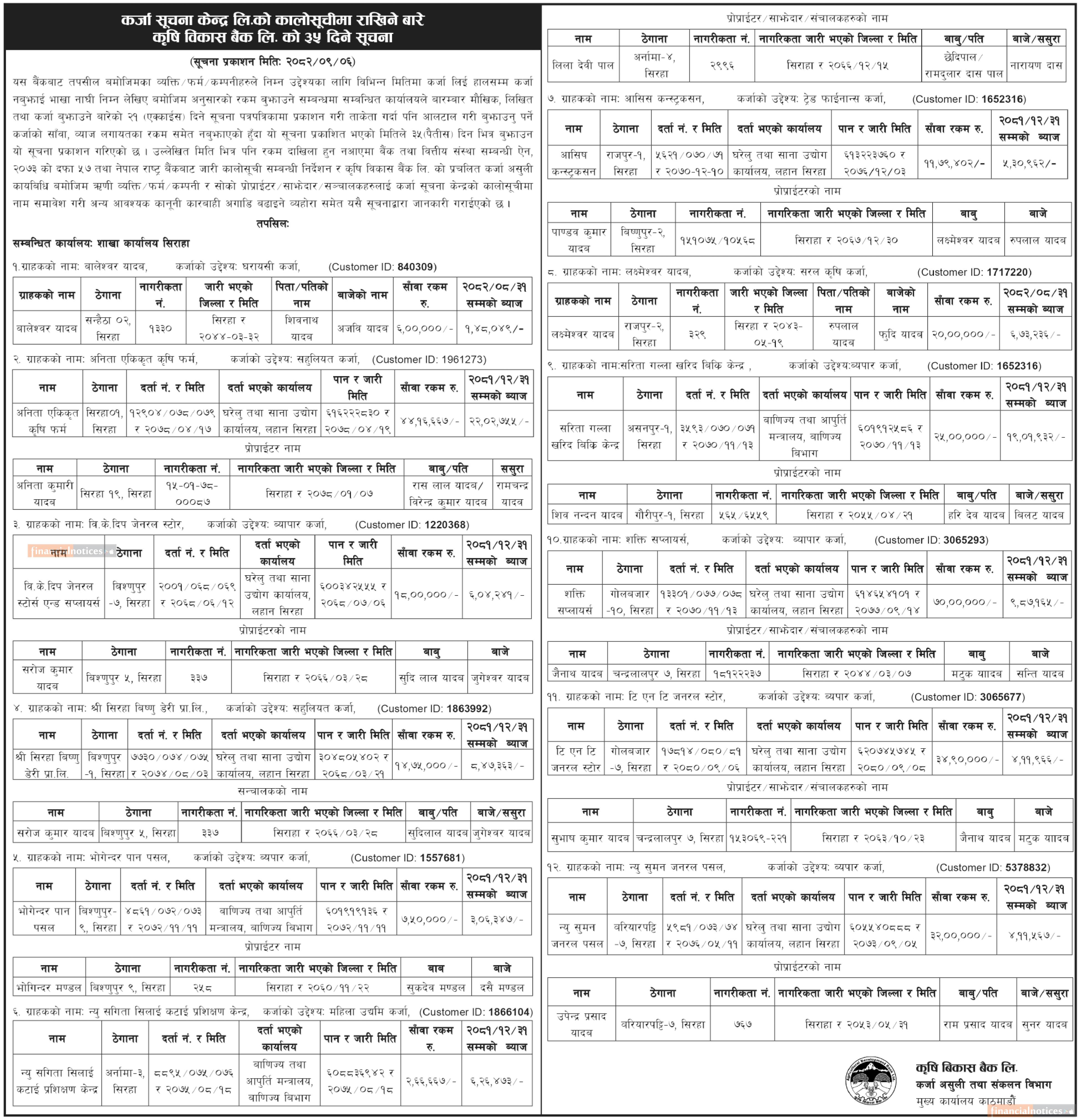 कालो सूचीमा राखिने बारेको कृषि विकास बैंकको सूचना