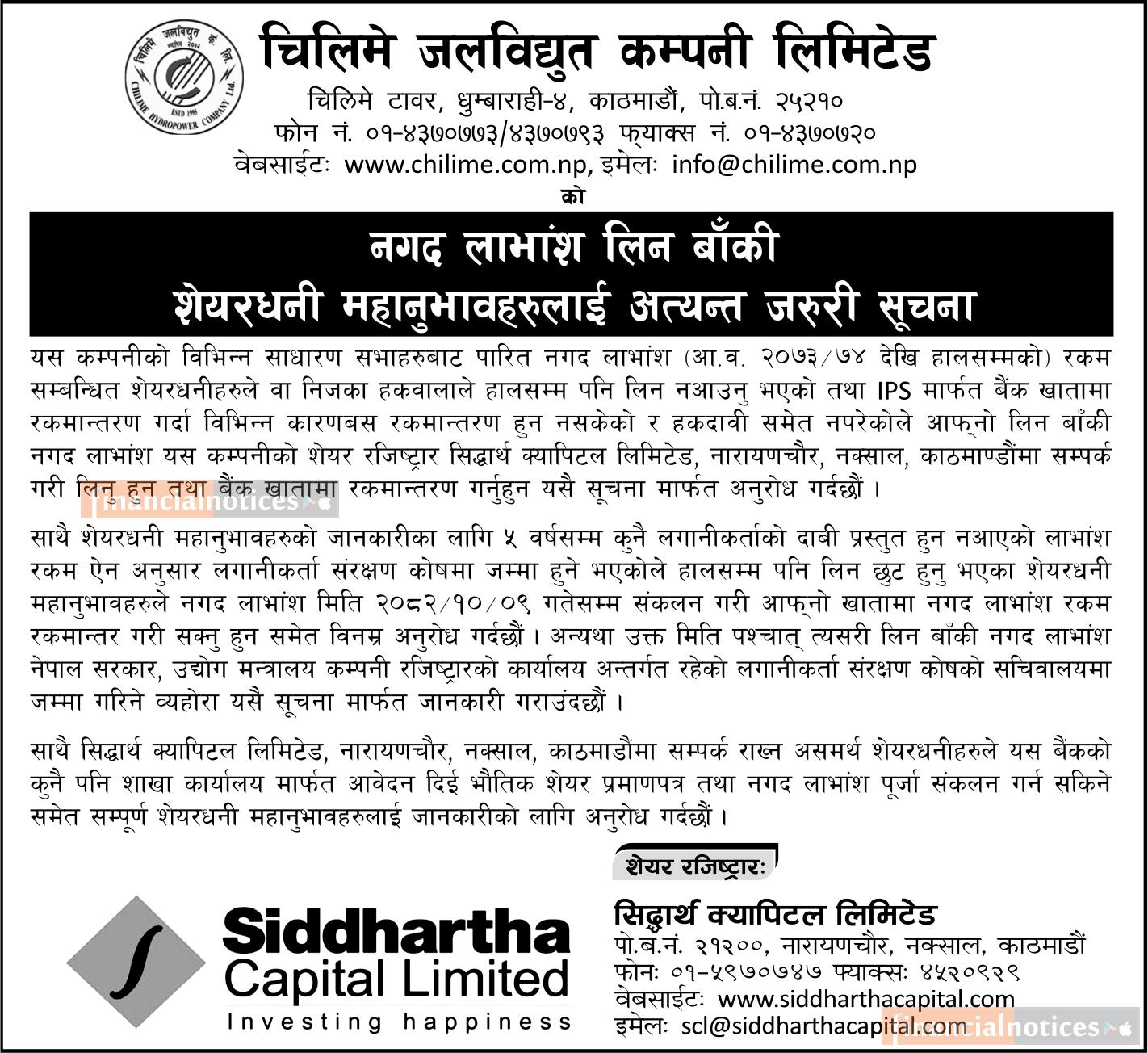 चिलिमे जलविद्युत कम्पनीको नगद लाभांस लिन बाँकी शेयरधनीहरुलाई जरुरी सूचना