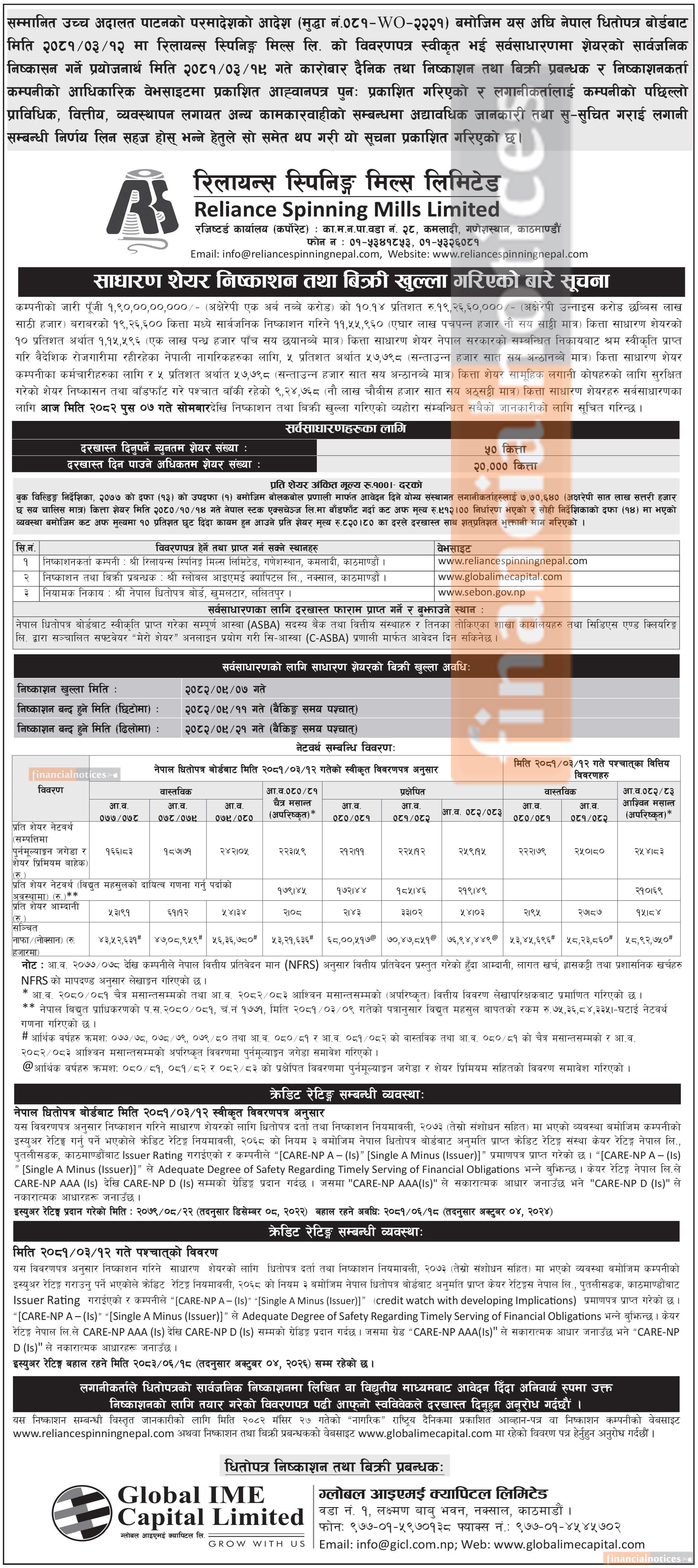 रिलायन्स स्पिनिङ्ग मिल्सको आईपीओमा आजदेखि सर्वसाधारणले आवेदन दिन सकिने सम्बन्धी सूचना