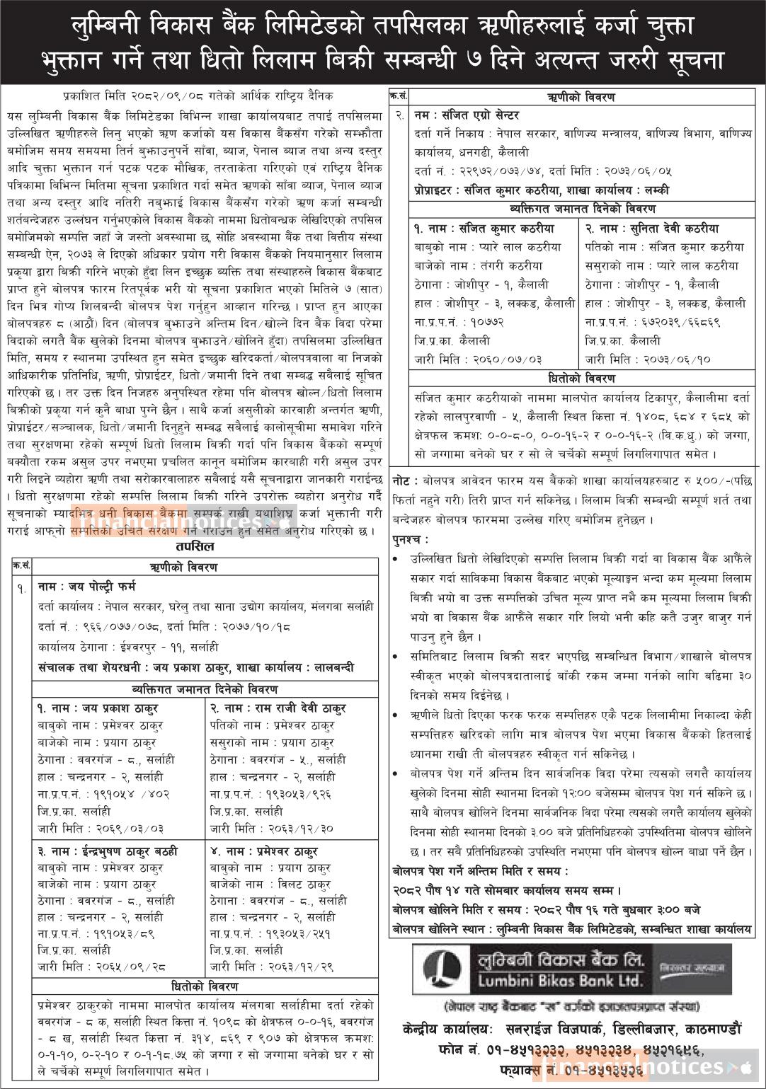 ऋणीहरुलाई कर्जा चुक्ता भुक्तान गर्ने तथा धितो लिलाम बिक्री सम्बन्धी सूचना -