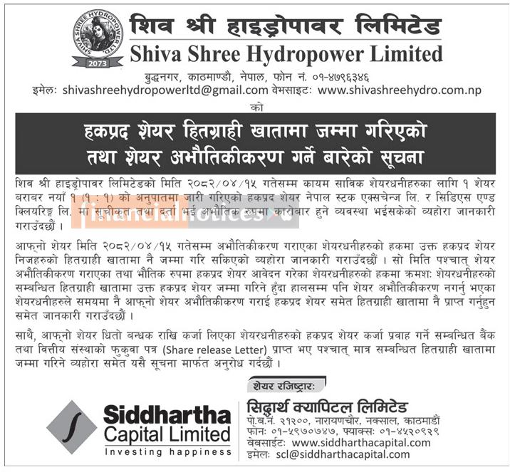 शिव श्री हाइड्रोपावरले हकप्रद सेयर हितग्राही खातामा जम्मा गरेको सार्वजनिक सूचना