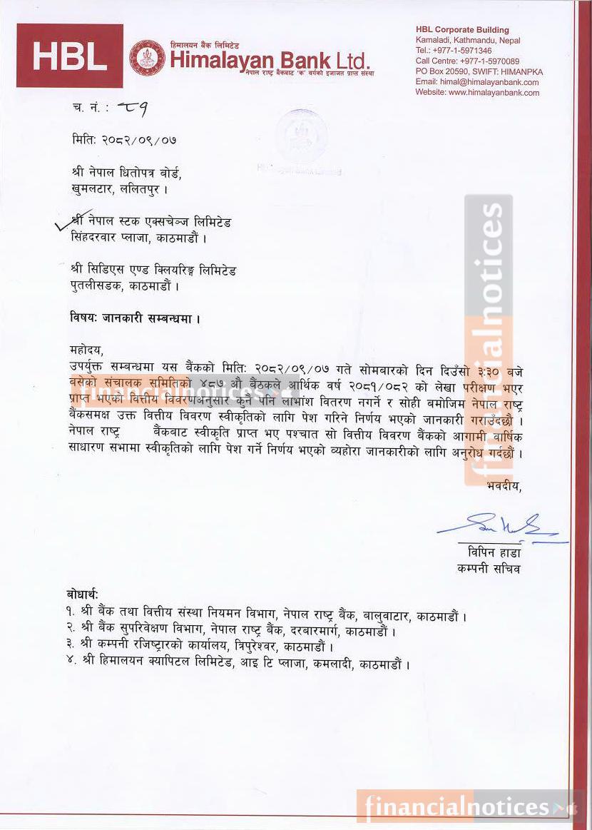 हिमालयन बैंकले गत आर्थिक वर्षको मुनाफाबाट शेयरधनीहरुलाई लाभांश वितरण नगर्ने सम्बन्धी सूचना