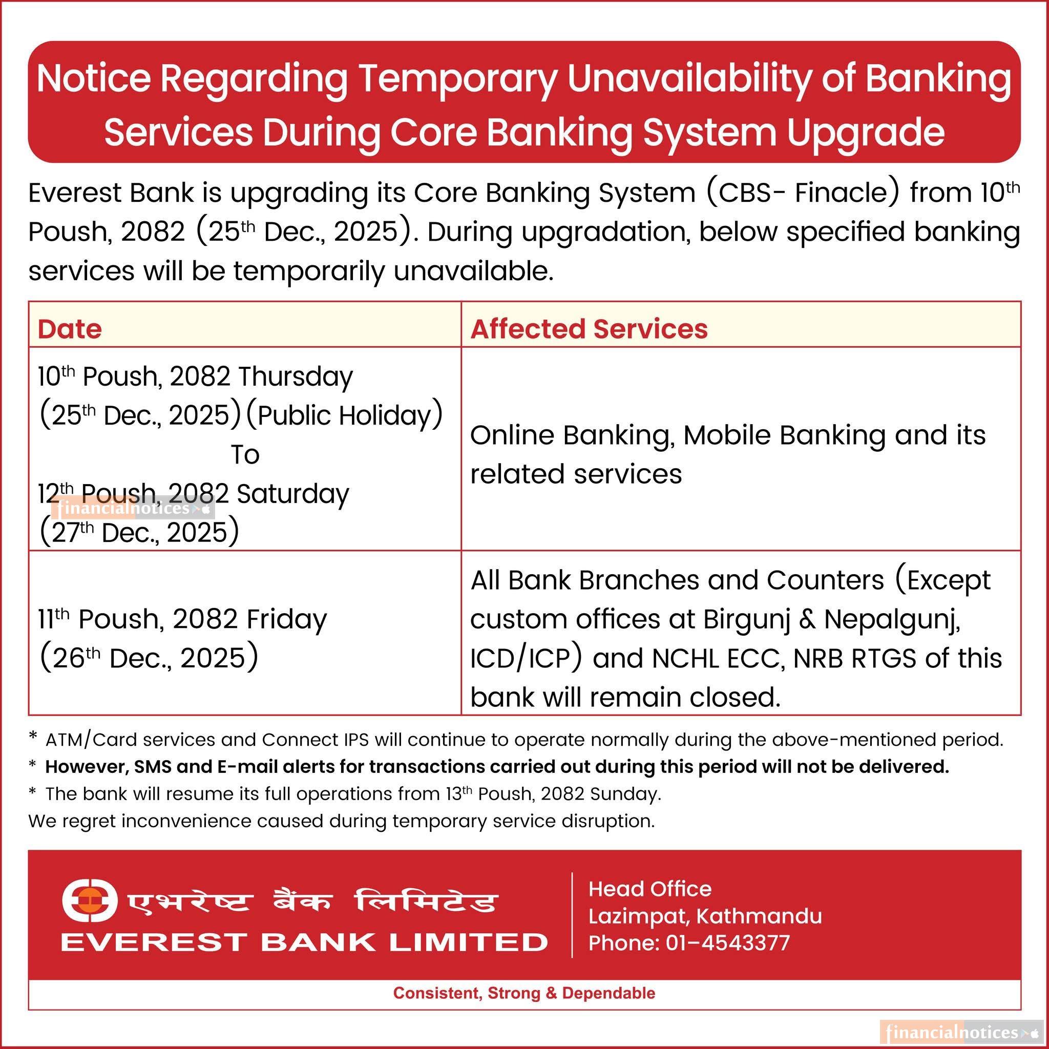 कोर बैंकिङ प्रणाली स्तरोन्नतिका कारण एभरेष्ट बैंकका सेवा अस्थायी रूपमा अवरुद्ध हुने सम्बन्धी सूचना