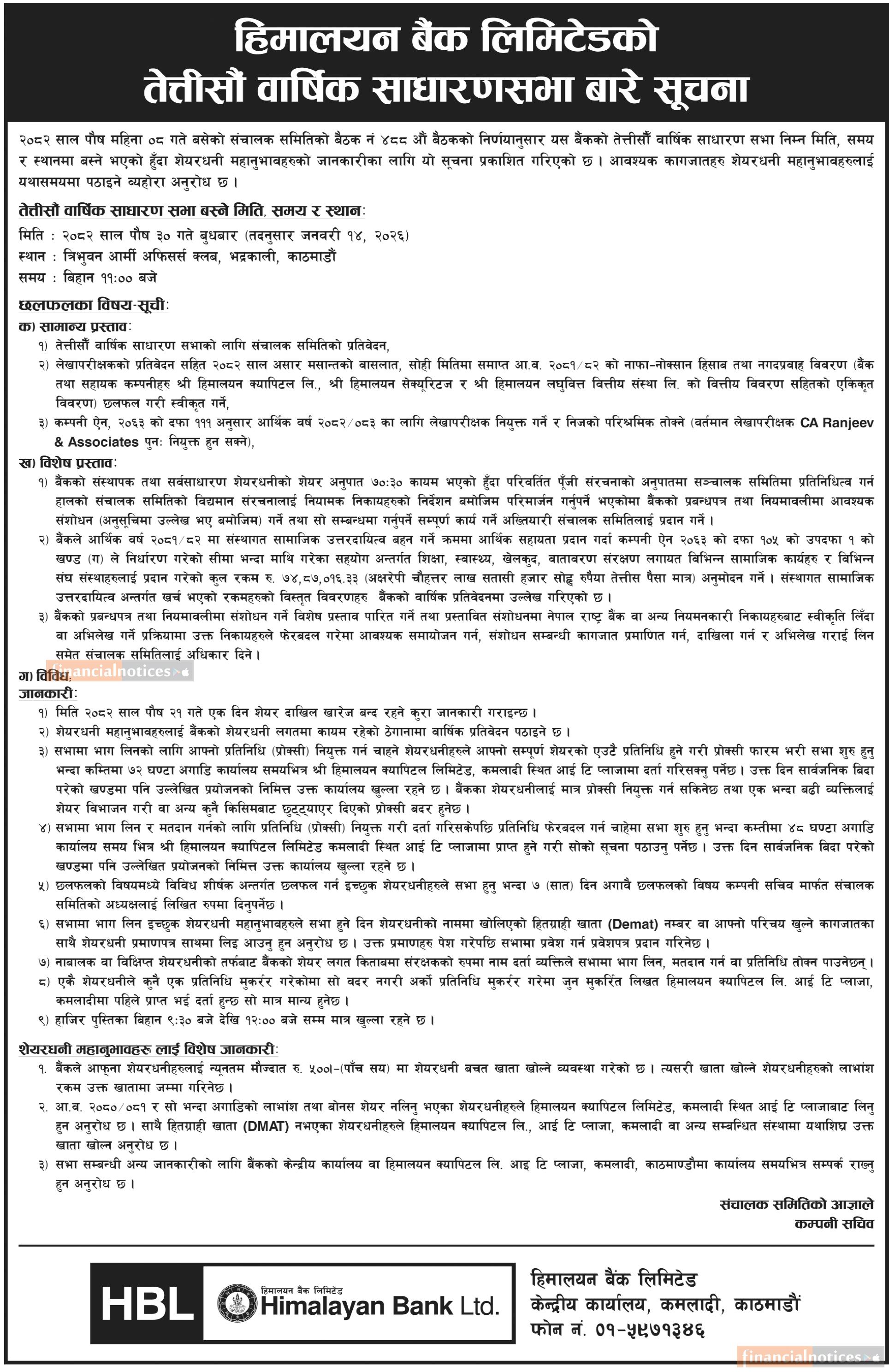 हिमालयन बैंकको तेत्तीसौँ वार्षिक साधारण सभा सम्बन्धी सूचना