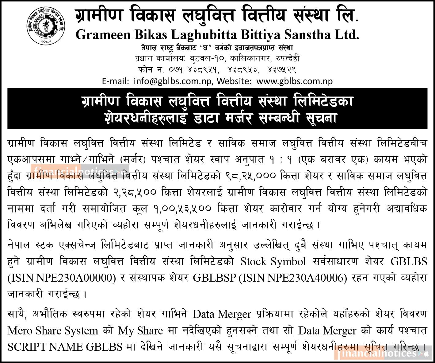 ग्रामीण विकास लघुवित्तको शेयरधनीहरुलाई डाटा मर्जर सम्बन्धी सूचना