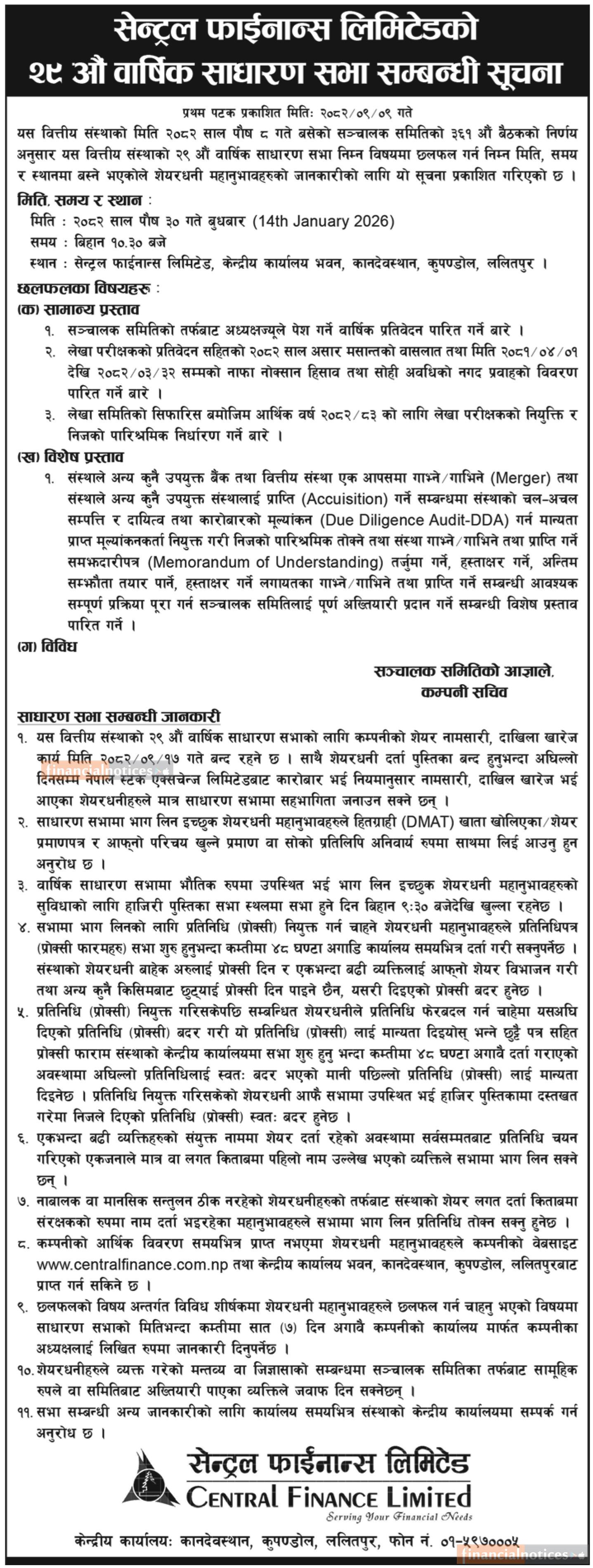 सेन्ट्रल फाइनान्सको २९औँ वार्षिक साधारण सभा सम्बन्धी सूचना