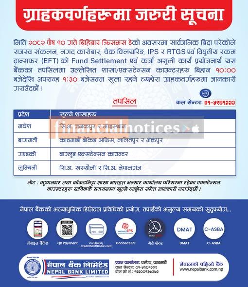 Notice regarding the opening of Nepal Bank branches during the Christmas holidays