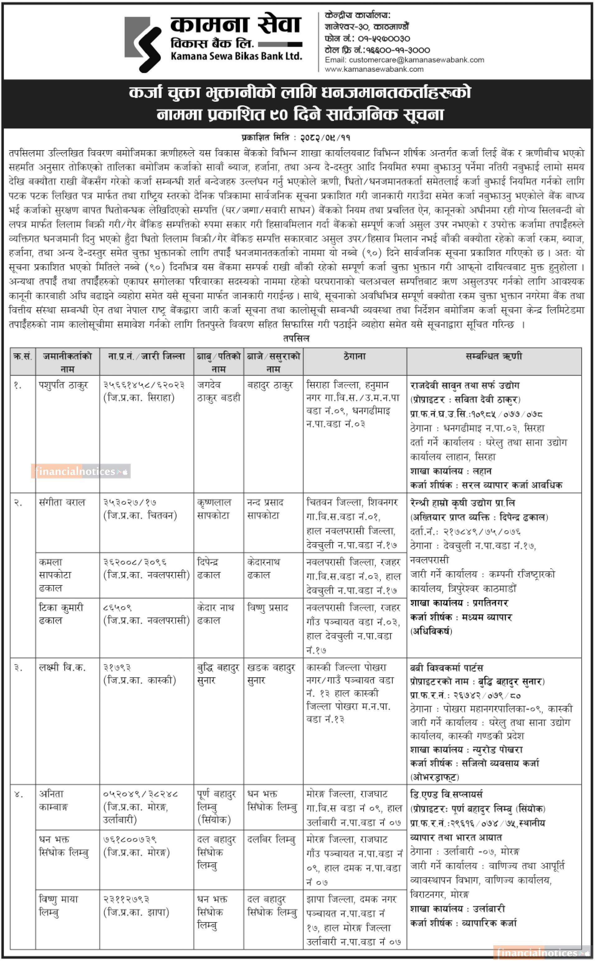 कर्जा चुक्ता भुक्तानीको लागि धनजमानतकर्ताहरुको नाममा प्रकाशित ९० दिने सूचना