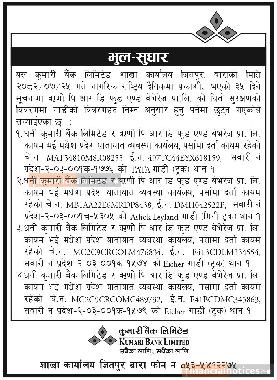 भुल सुधार गरिएको सम्बन्धी कुमारी बैंकको जरुरी सूचना